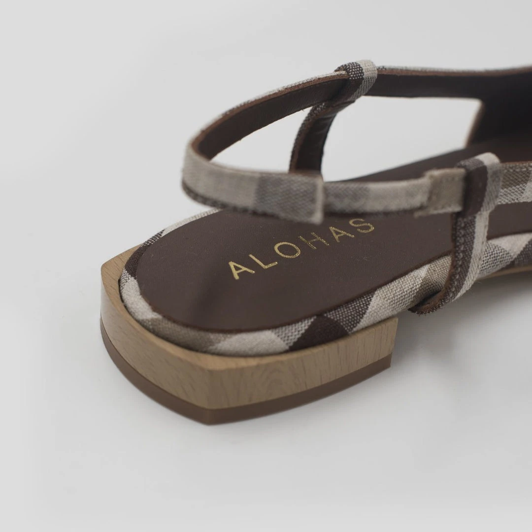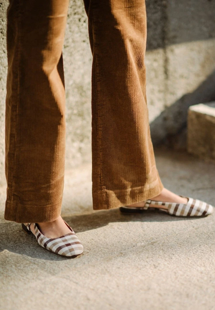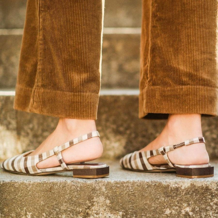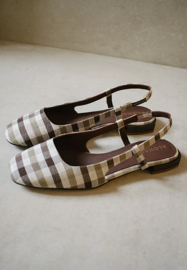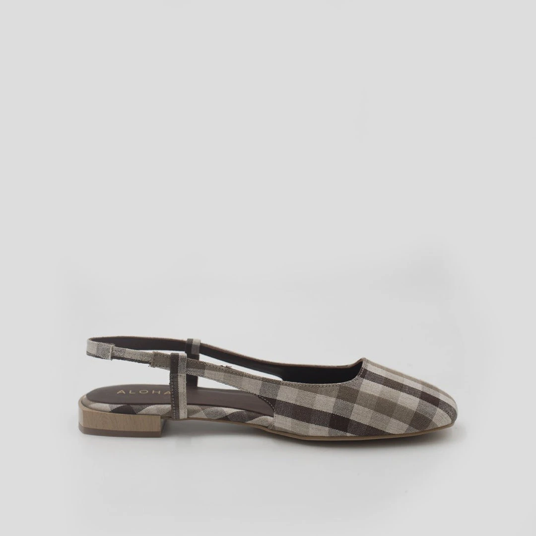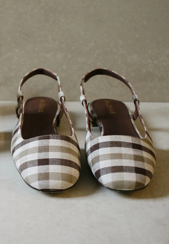 Flat ballerina-inspired loafers. The perfect amount of playful sophistication to add to a polished daytime look. Semi-round front end held together with a practical back strap that leaves both sides half open. Available in beige leather as well as a brown check pattern in canvas.