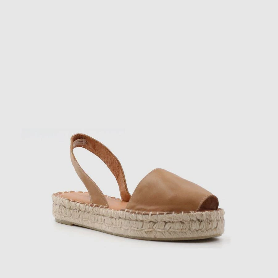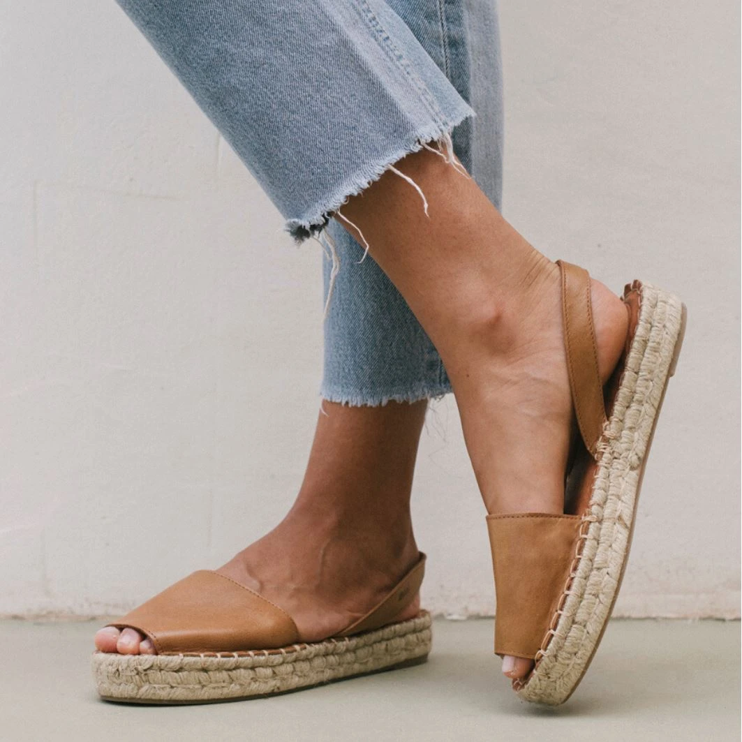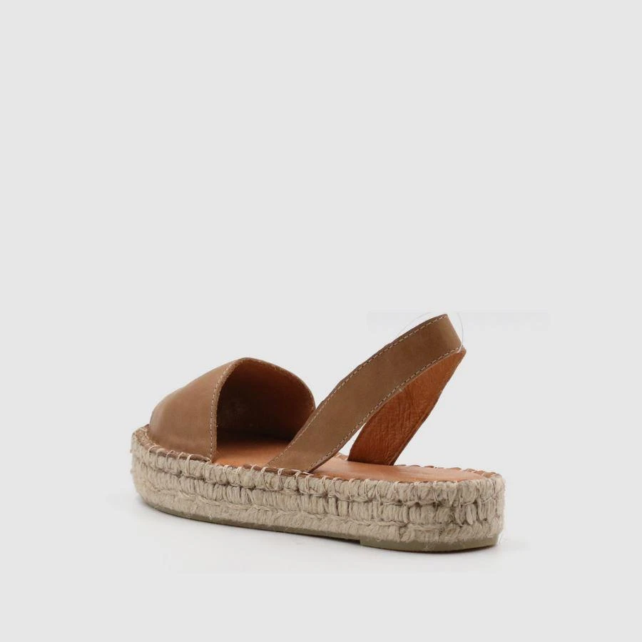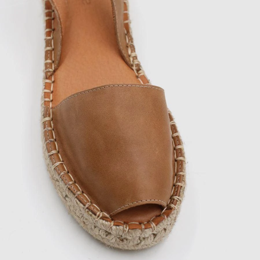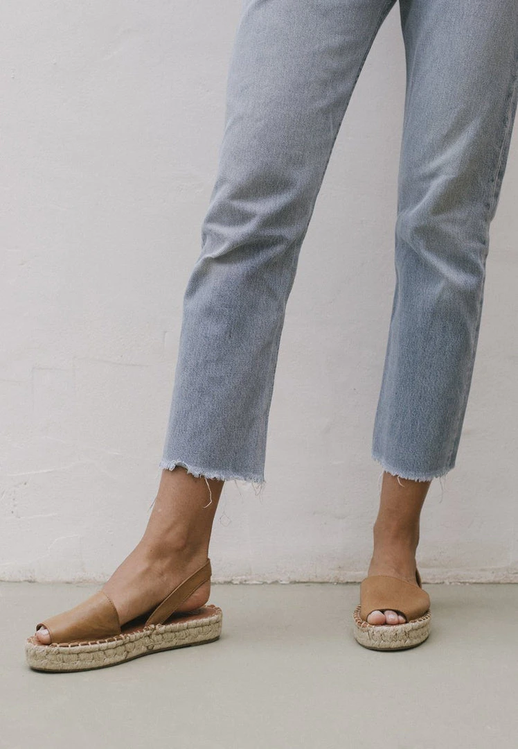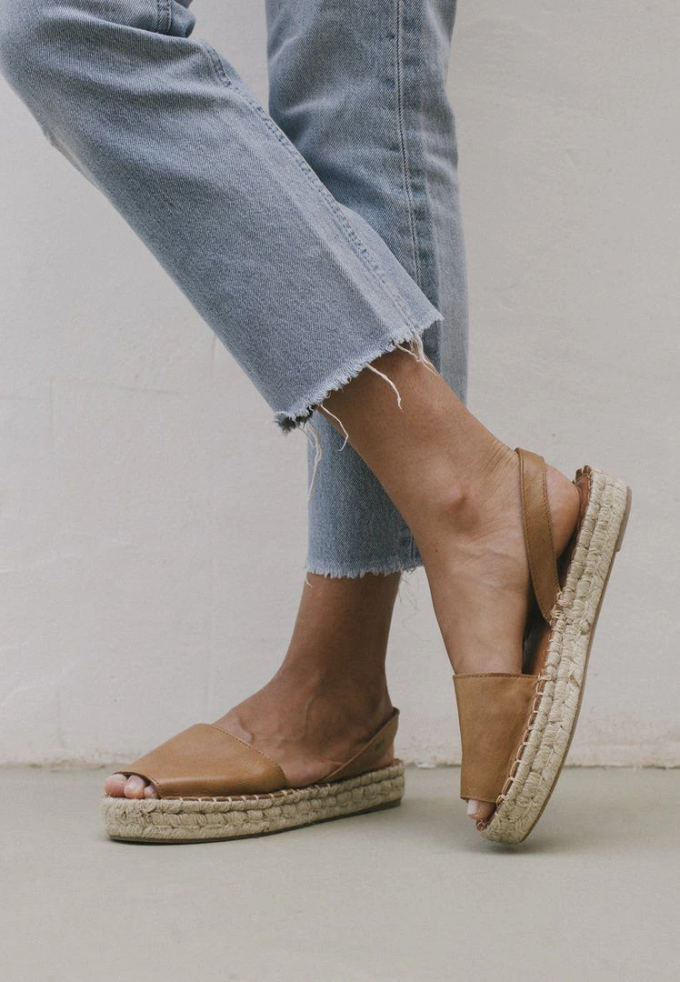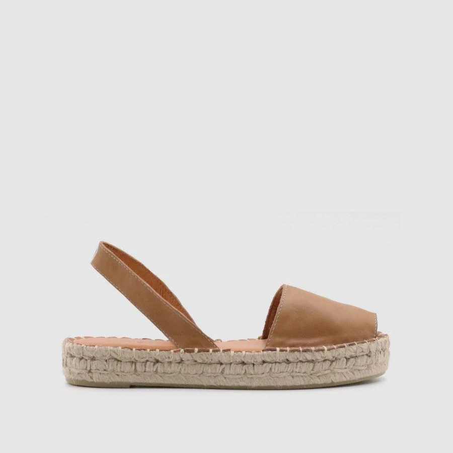 Ankle strap brown leather espadrilles typical of the Spanish Balearic region. Featuring a wide front strap that covers the instep and a sole ankle strap. They have an open toe for breathability and chicness and a comfortable, camel colored sole with a slight elevation. Back strap can be worn up or down, anything goes in Ibiza.