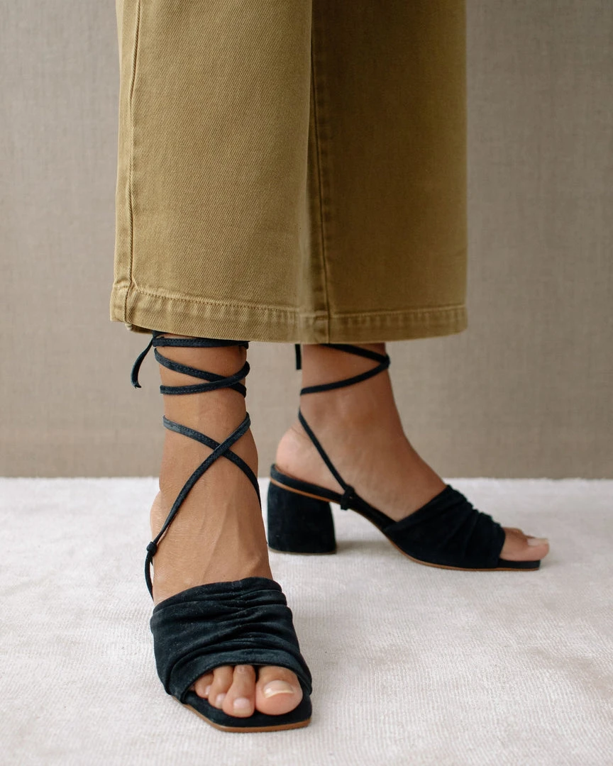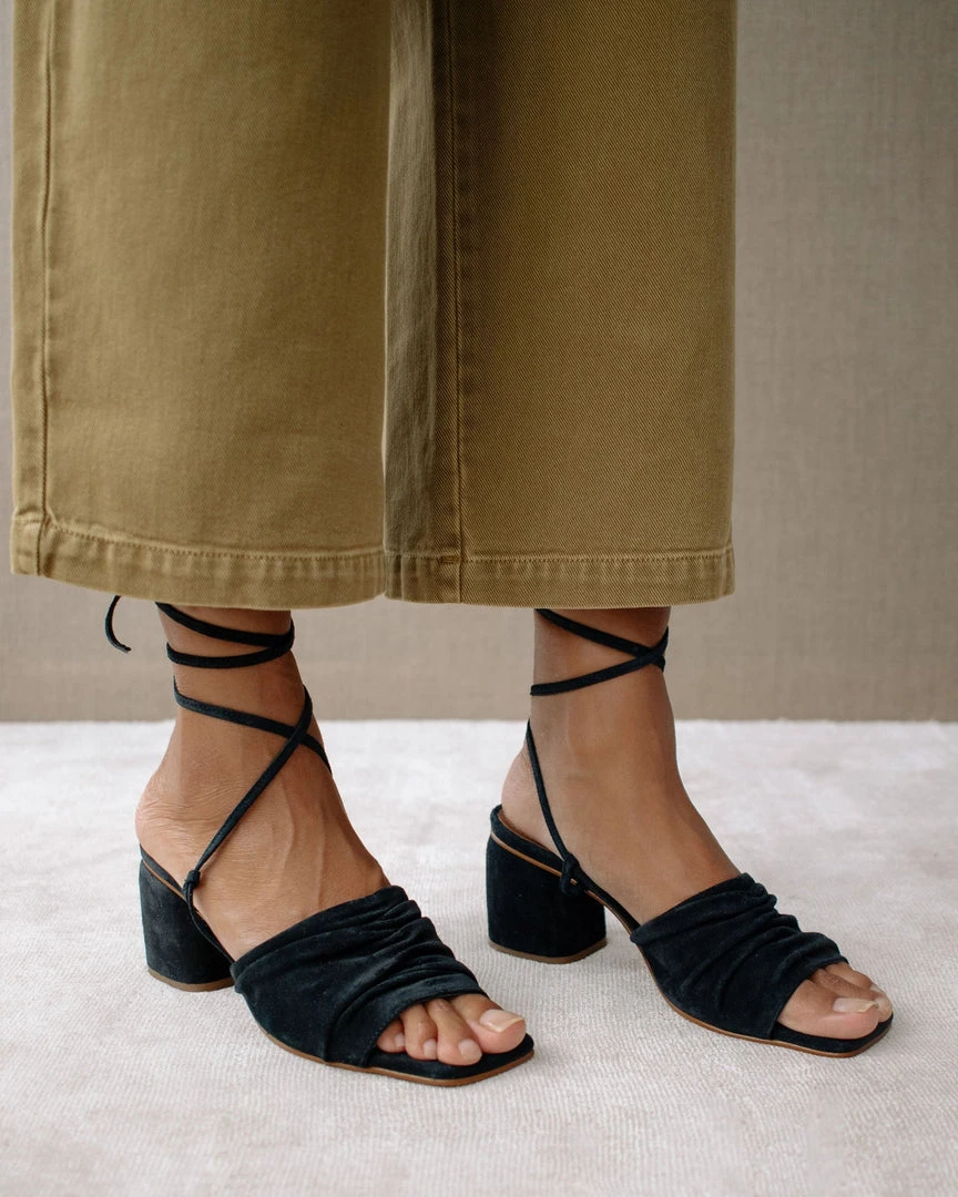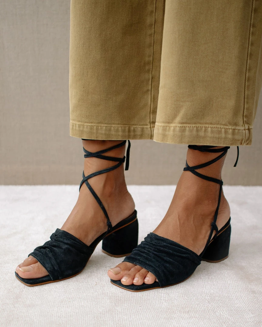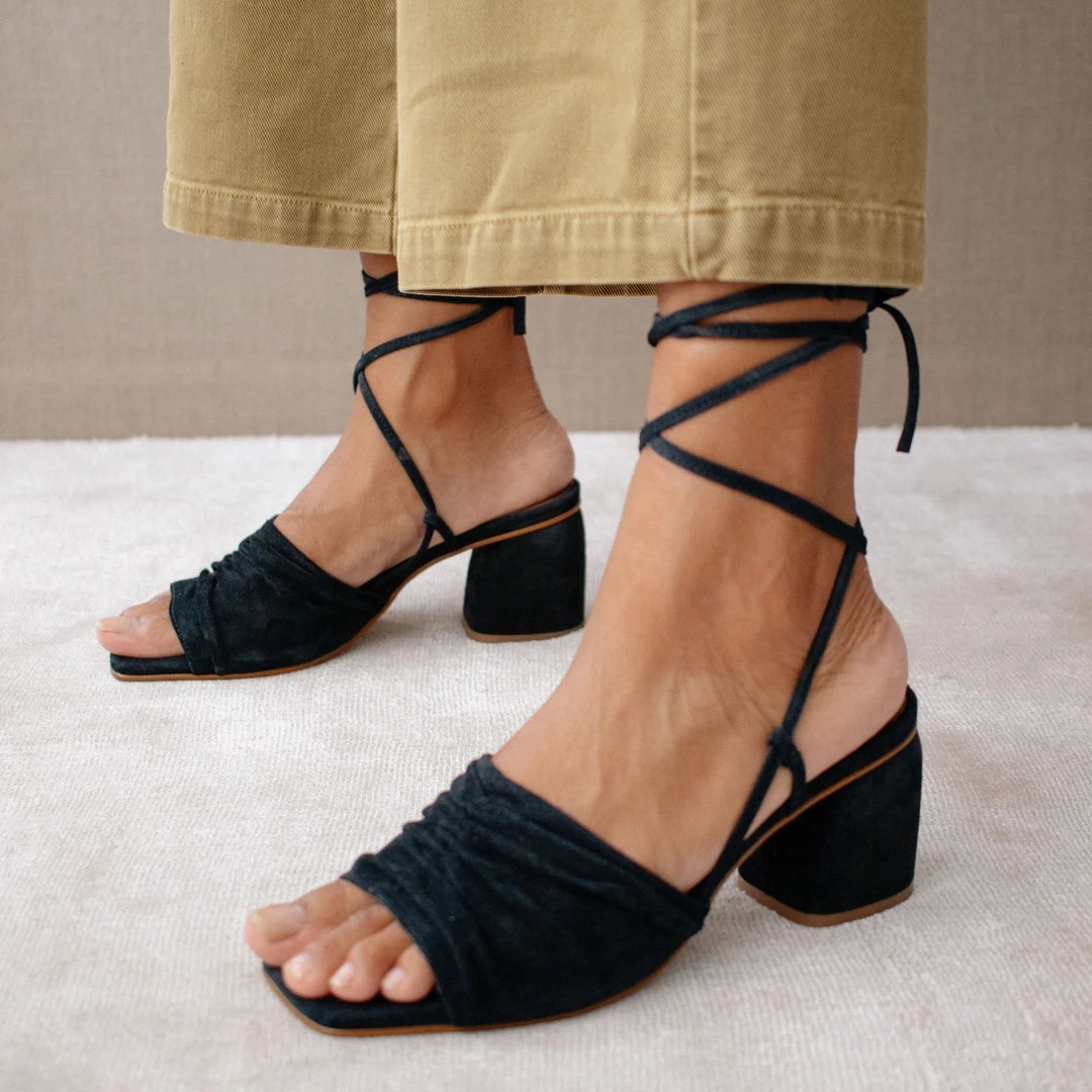 Ruffled front covering, leaving an open toe. Criss cross straps up the ankle for a comfortable hold. Featuring a soft edged block heel.