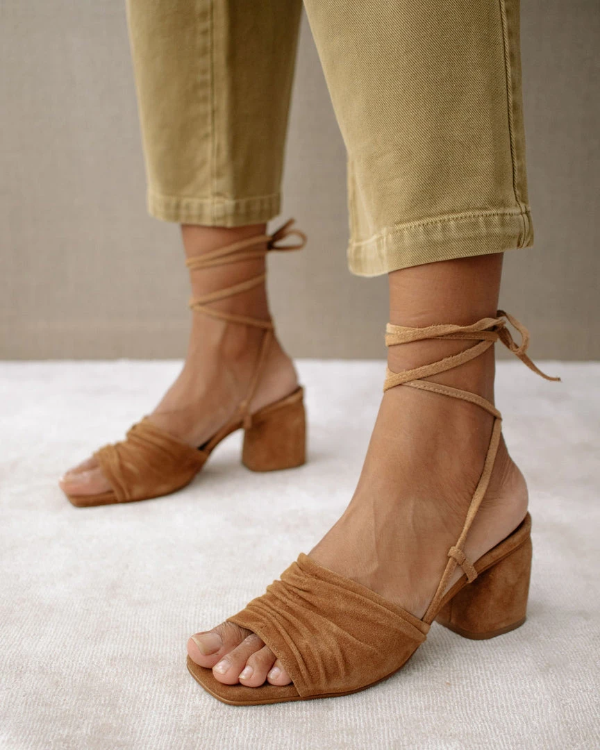 Ruffled front covering, leaving an open toe. Criss cross straps up the ankle for a comfortable hold. Featuring a soft edged block heel.