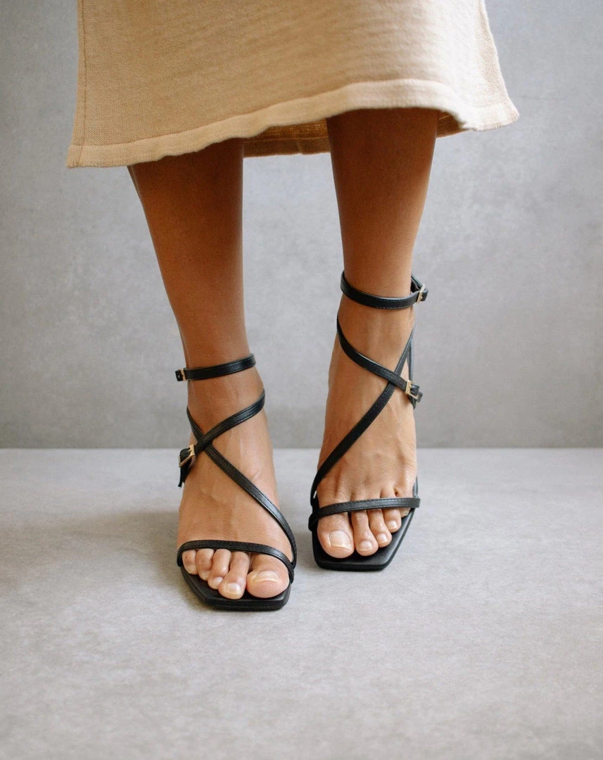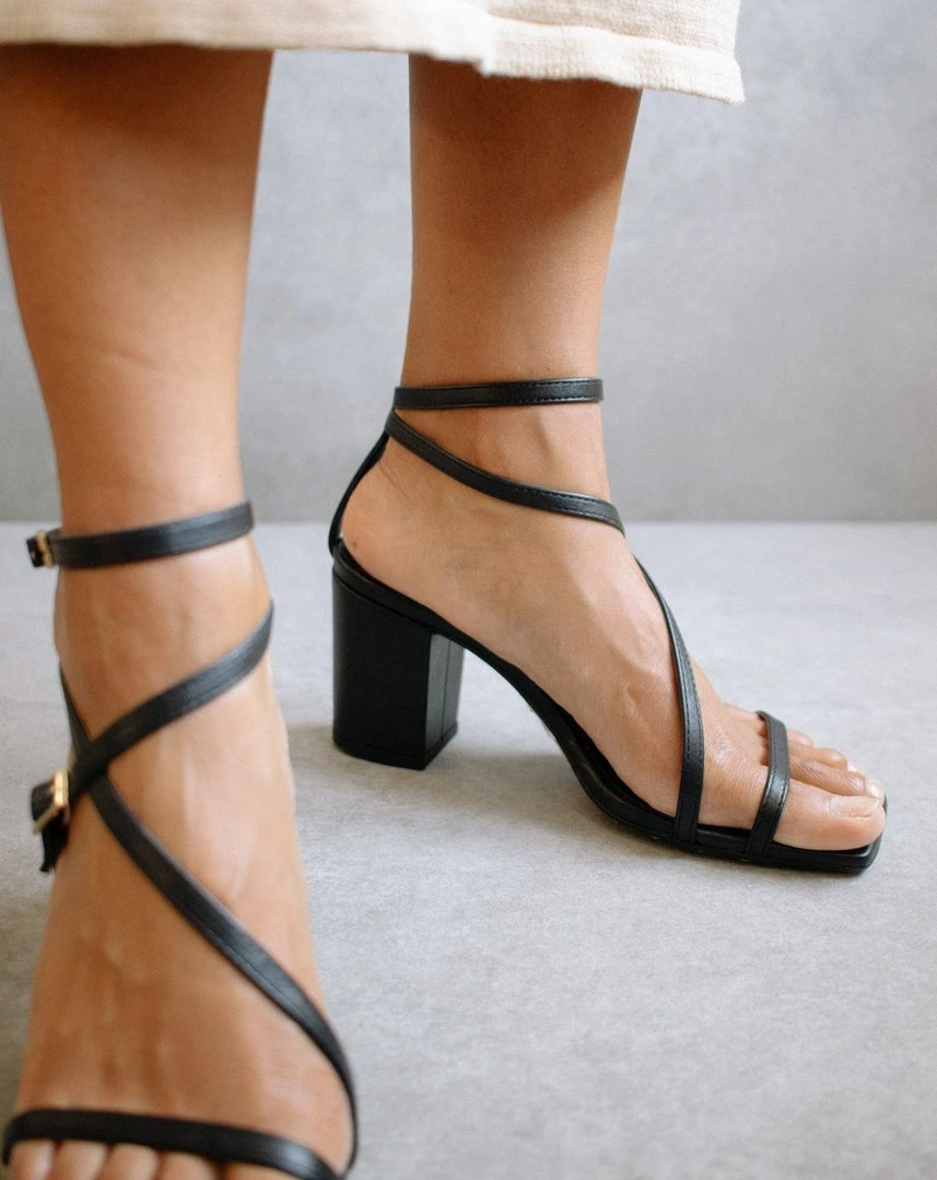 Leather sandal featuring thin straps contrasted by a chunky block heel. Double mini buckles criss crossed along the upper and lower ankle.