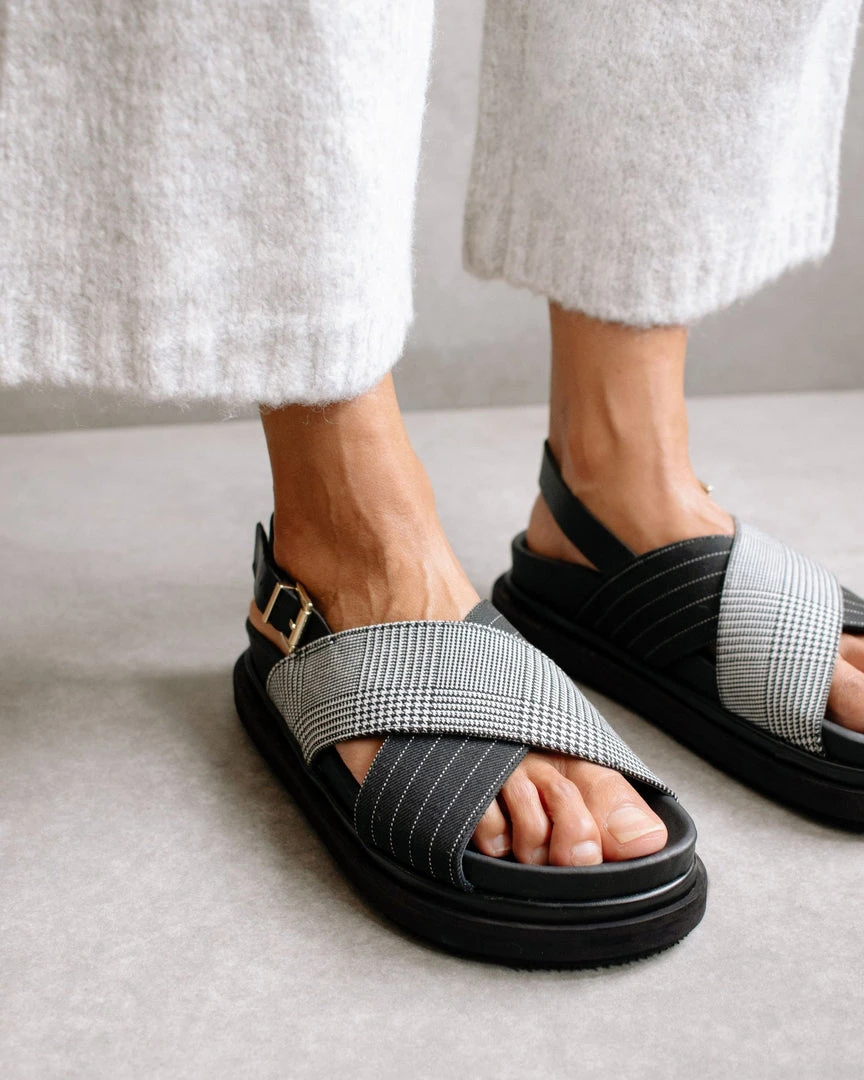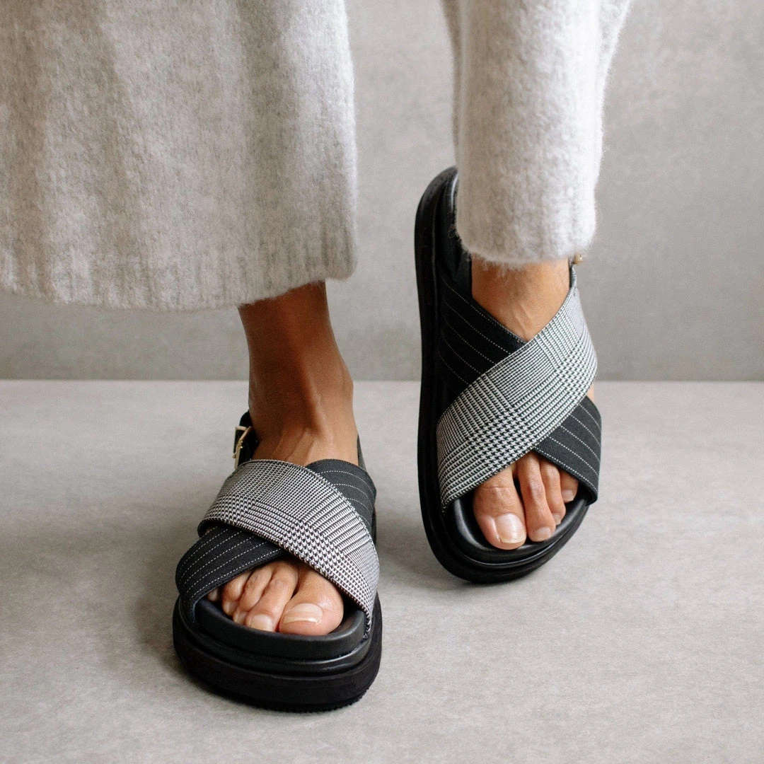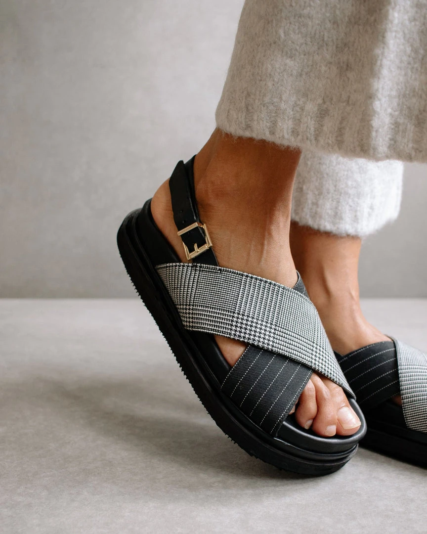A 90s inspired oversized slipper sandal featuring a maxi double layered sole. Criss-crossed front hold and a buckled back strap for added comfort.