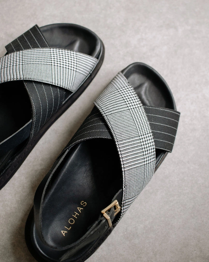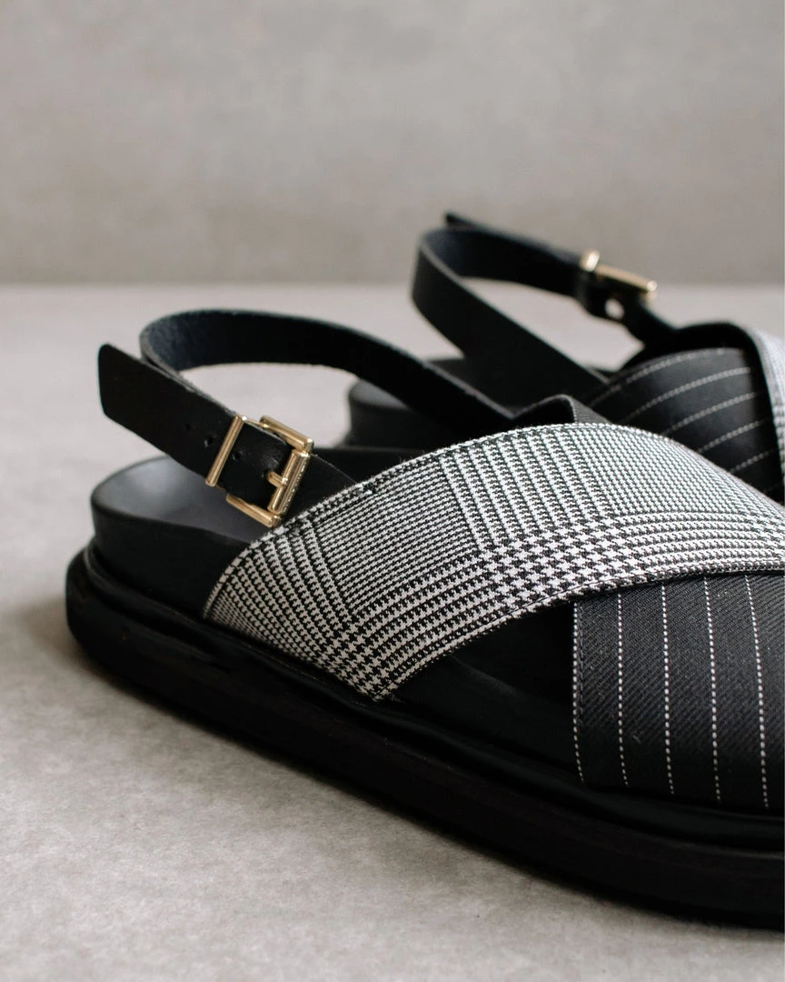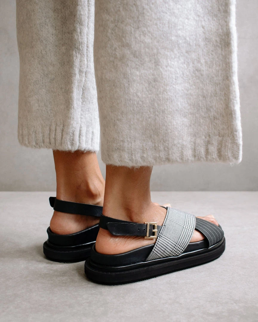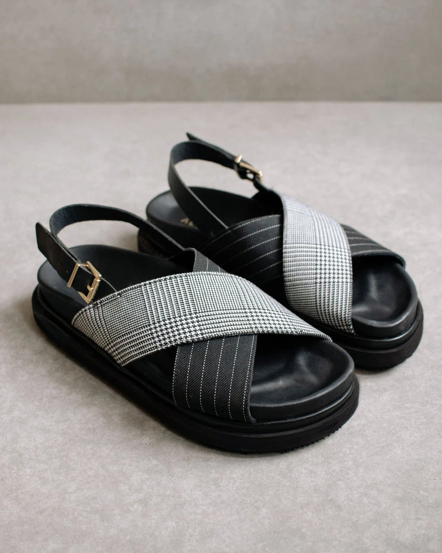 A 90s inspired oversized slipper sandal featuring a maxi double layered sole. Criss-crossed front hold and a buckled back strap for added comfort.