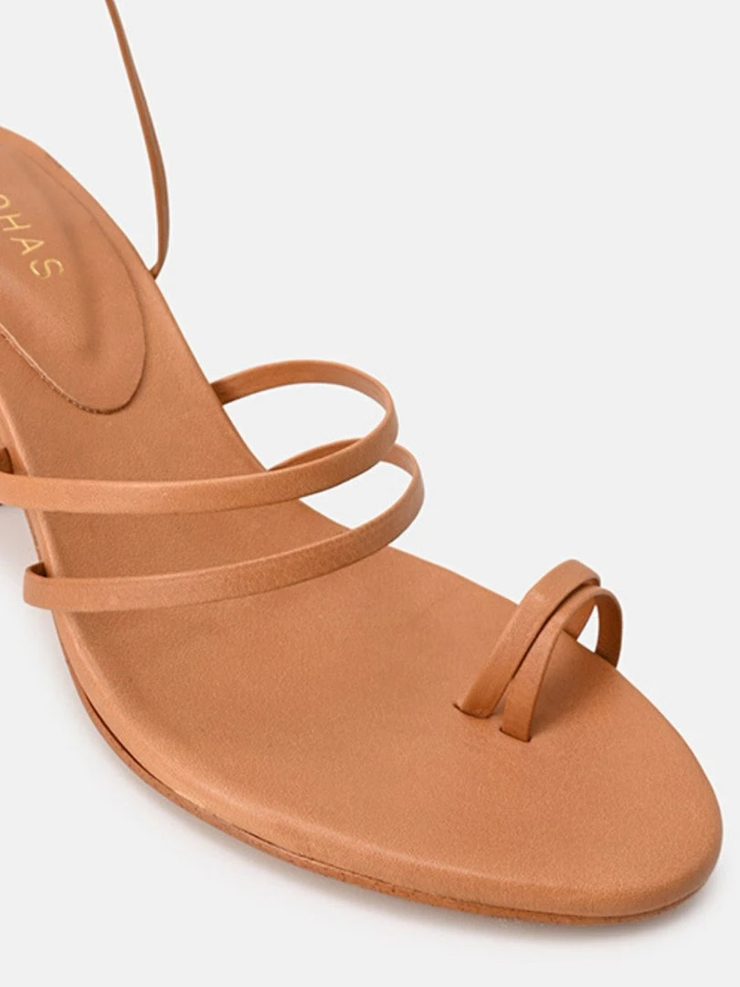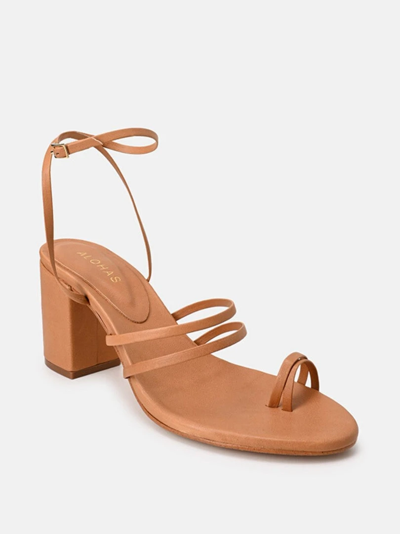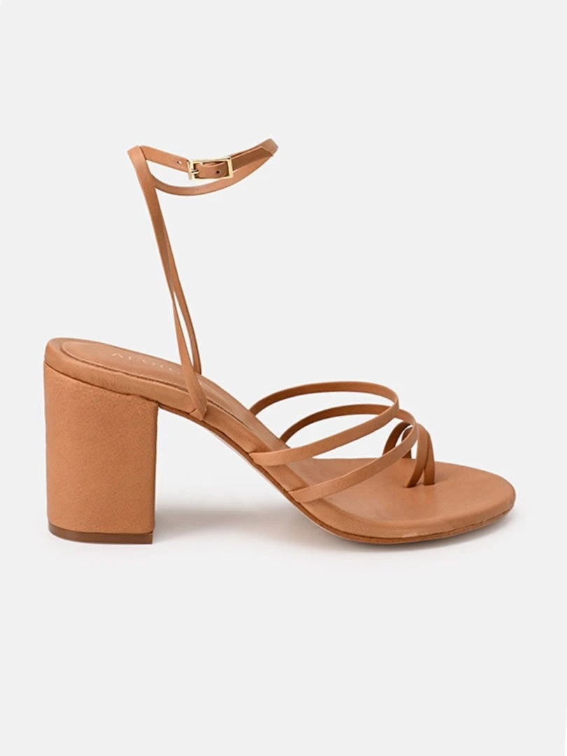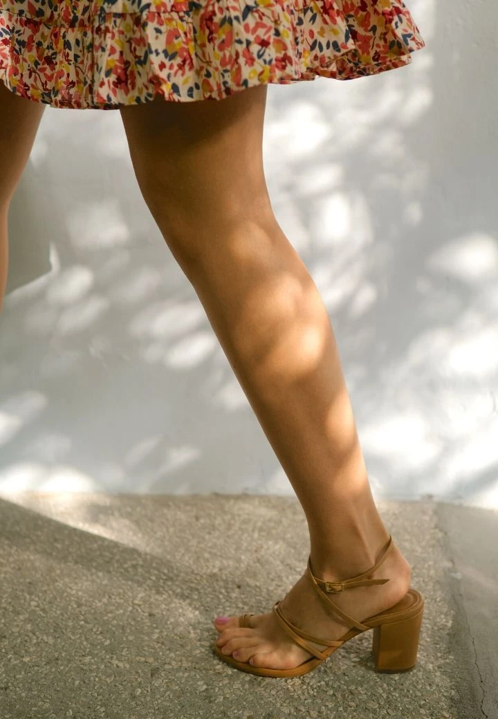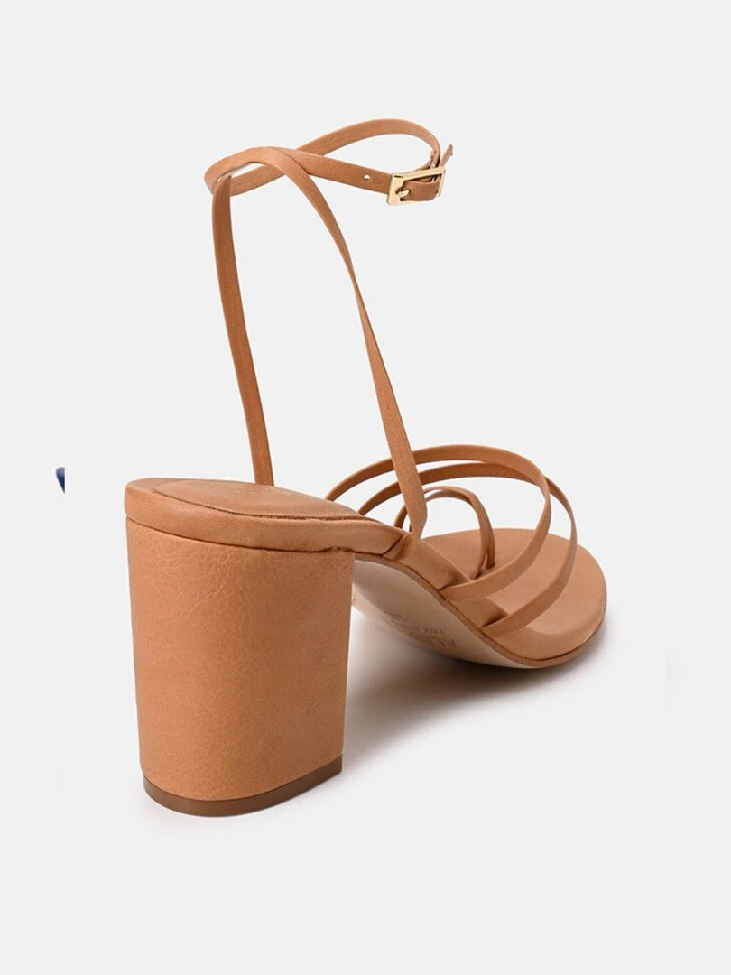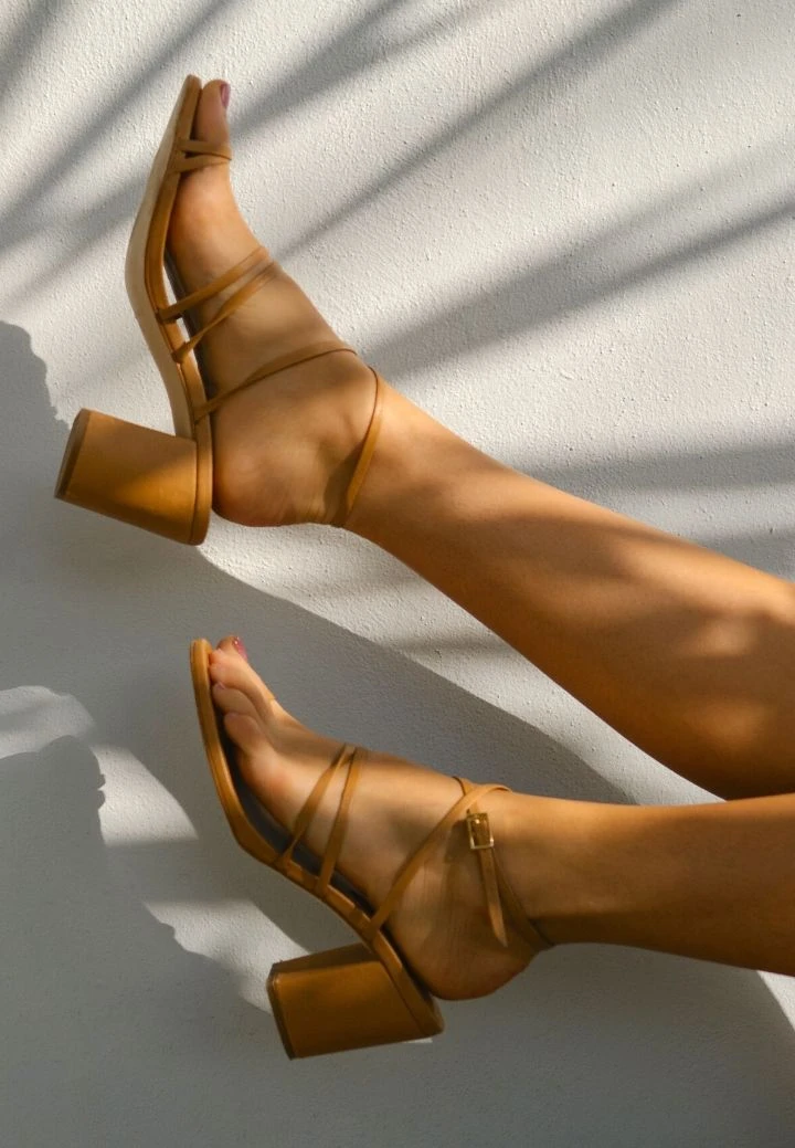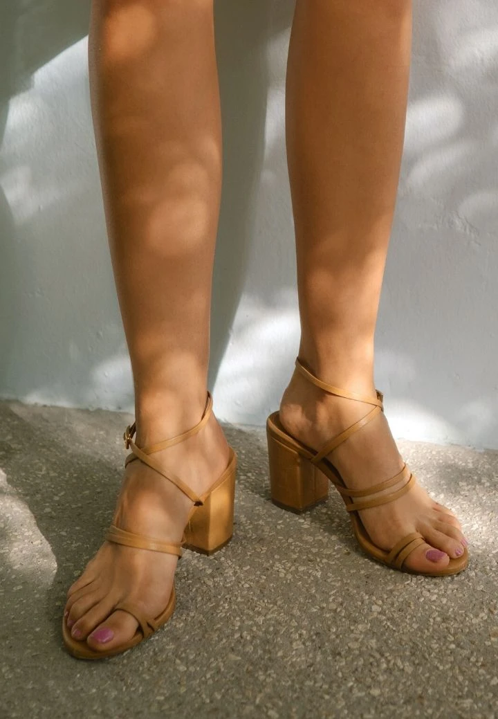 Double frontal straps and double toe straps for a fun summery shoe. Ankle strap crossed over the front with a minimalist side buckle. Wide a medium-sized heel for elevation sans the pain.