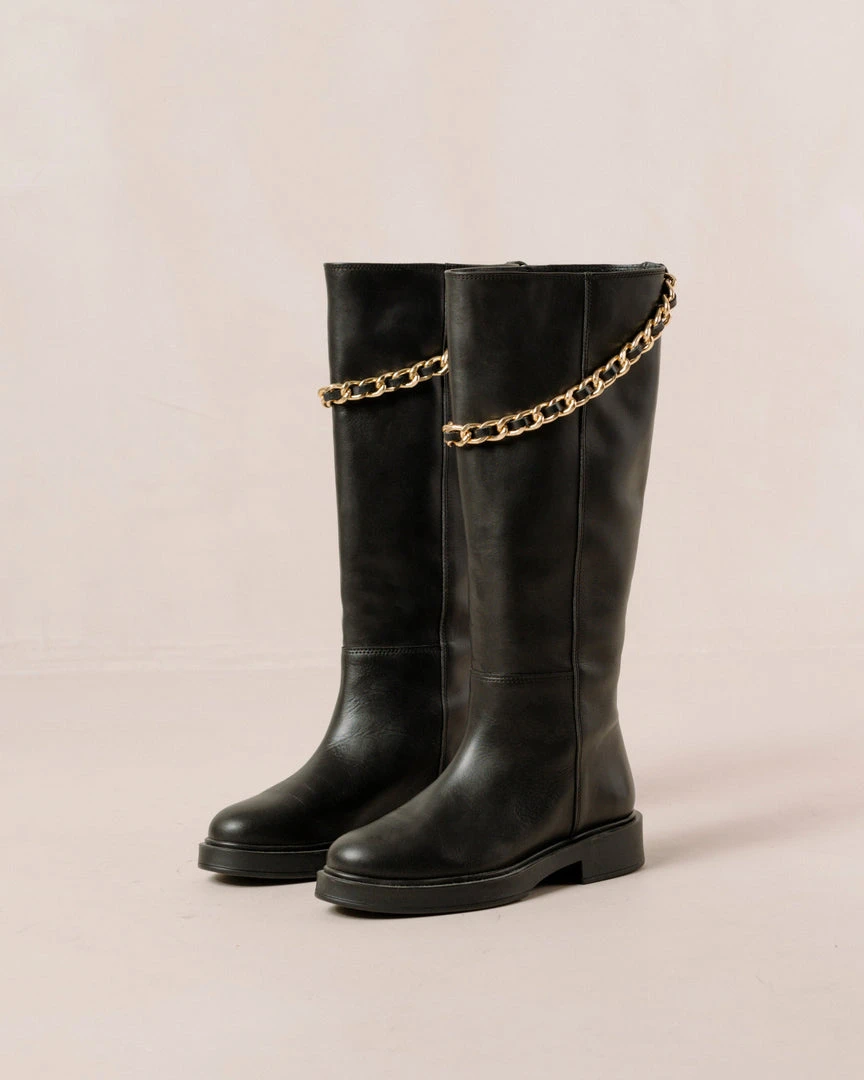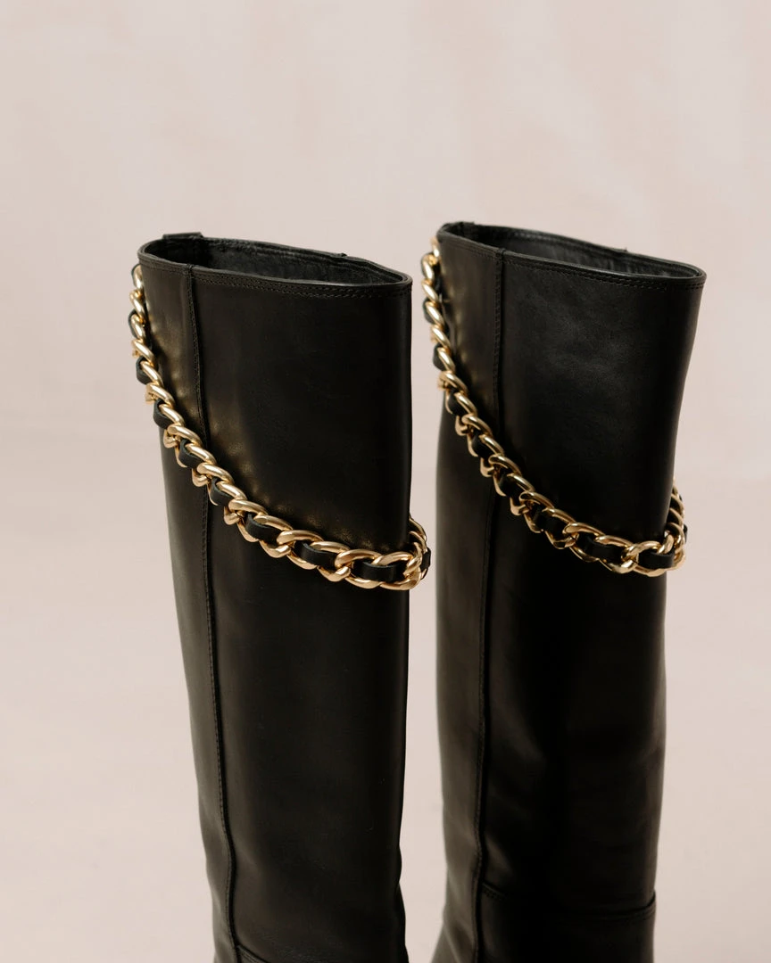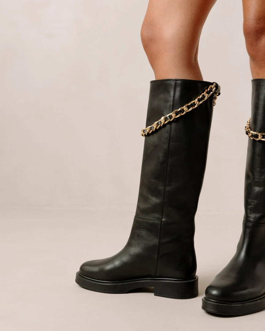 Knee height boot with a round toe and a chunky sole. Featuring an upper gold chain for some extra sass.