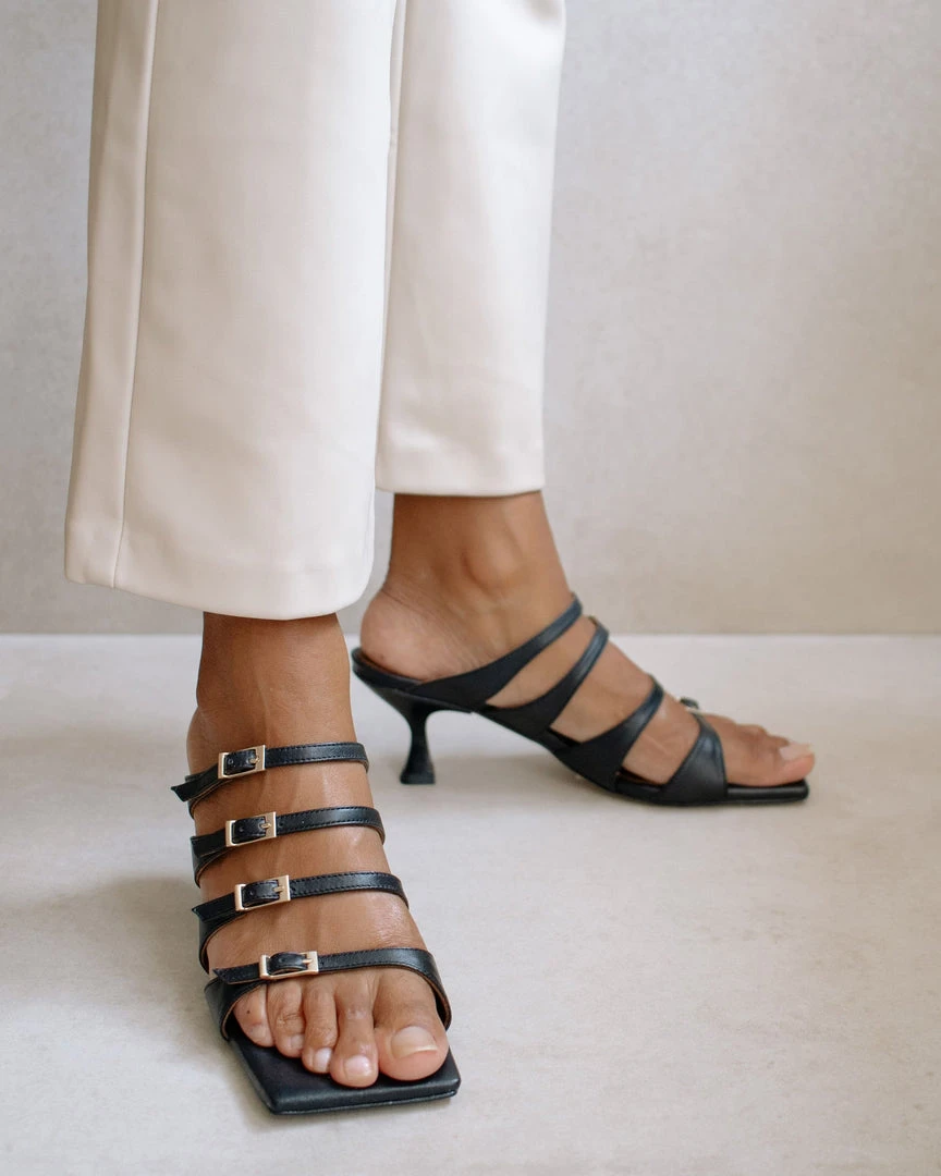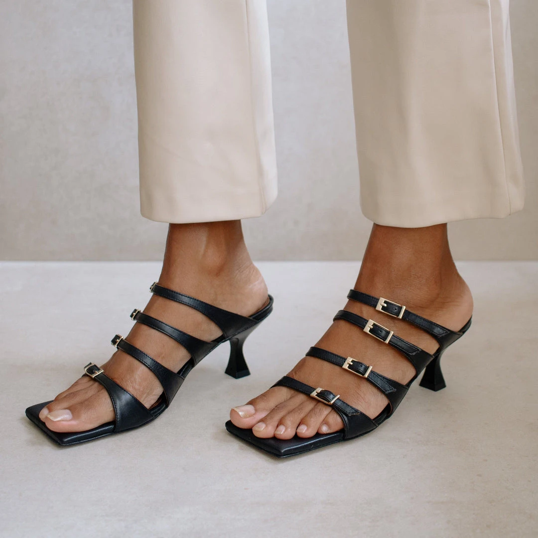 Four mini-buckled straps make for a strong hold for this open toed, square soled sandal. Featuring a kitten heel.