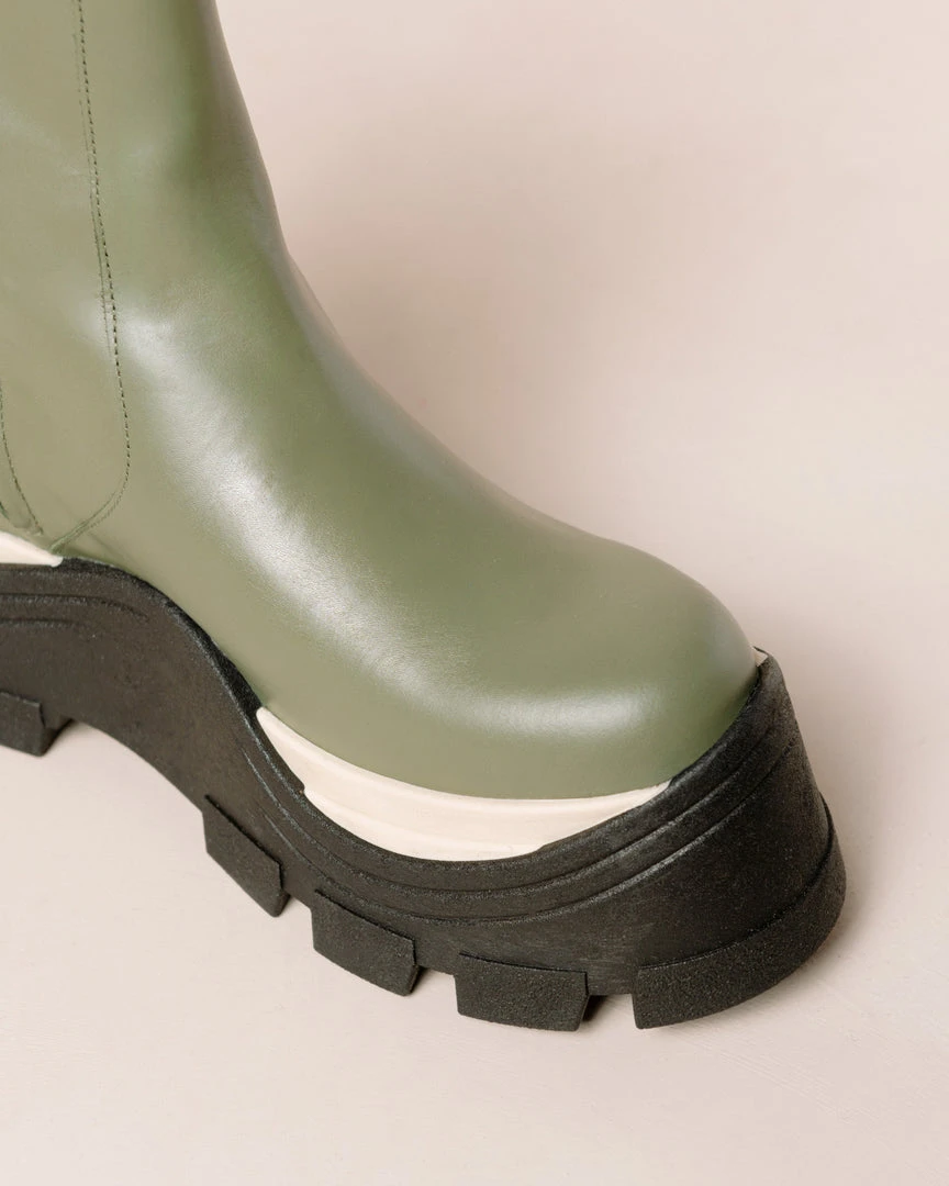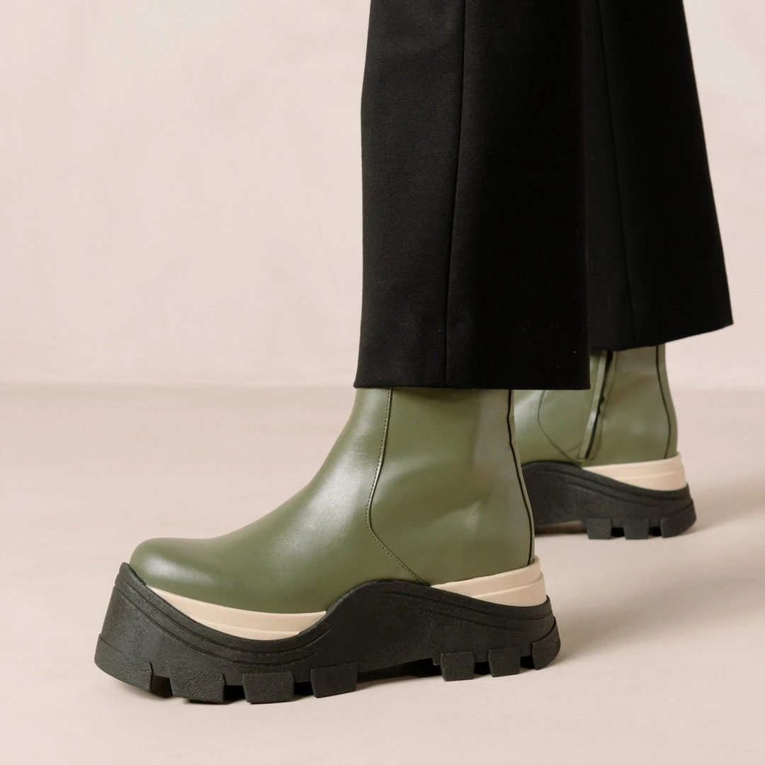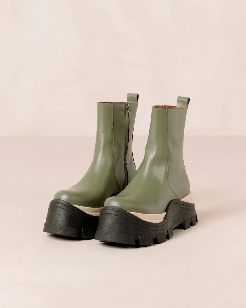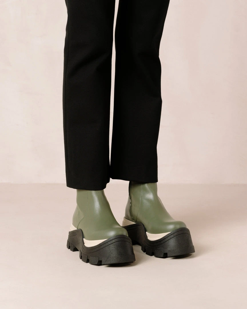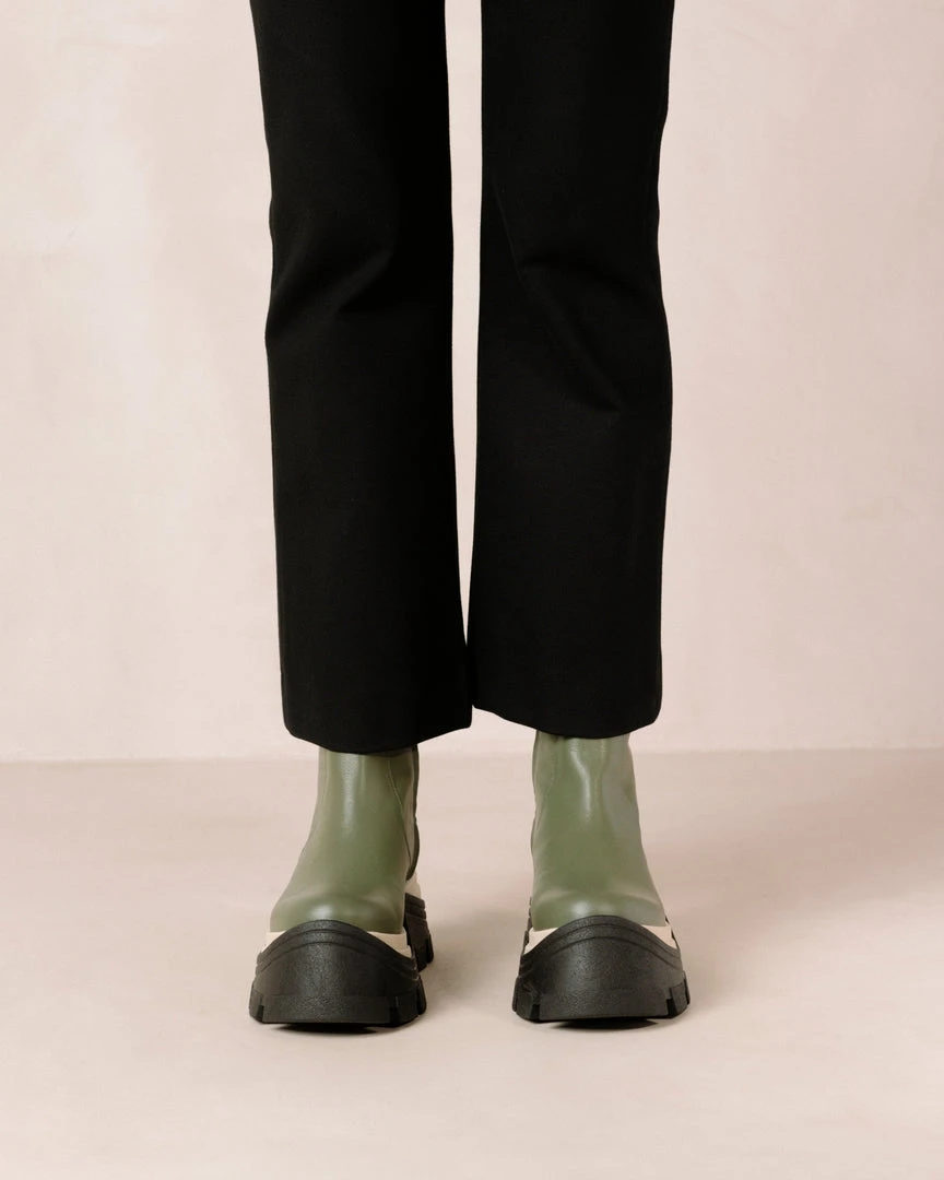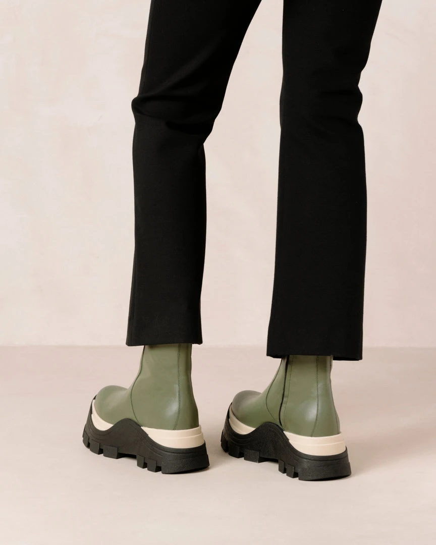 Low ankle chelsea boot with a thick track sole with an elastic side panel. The perfect companion for fall.