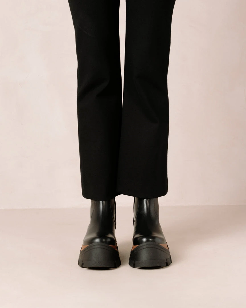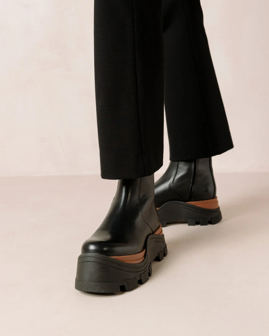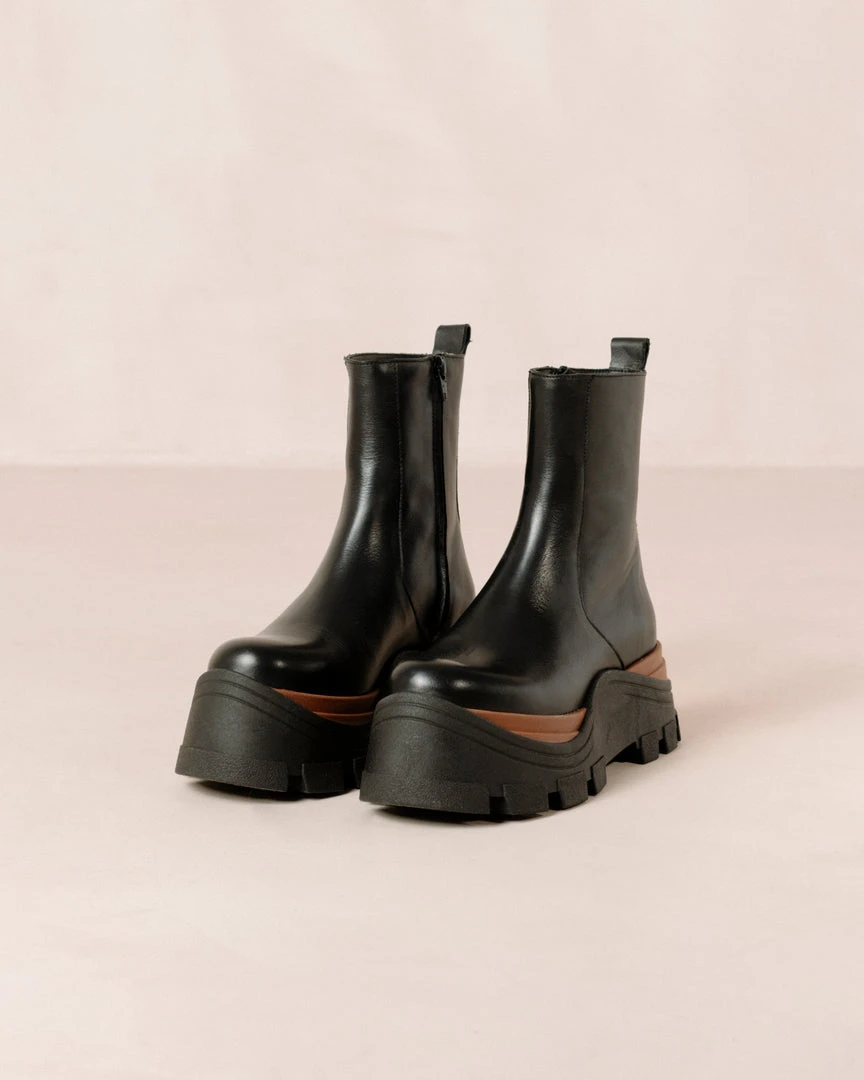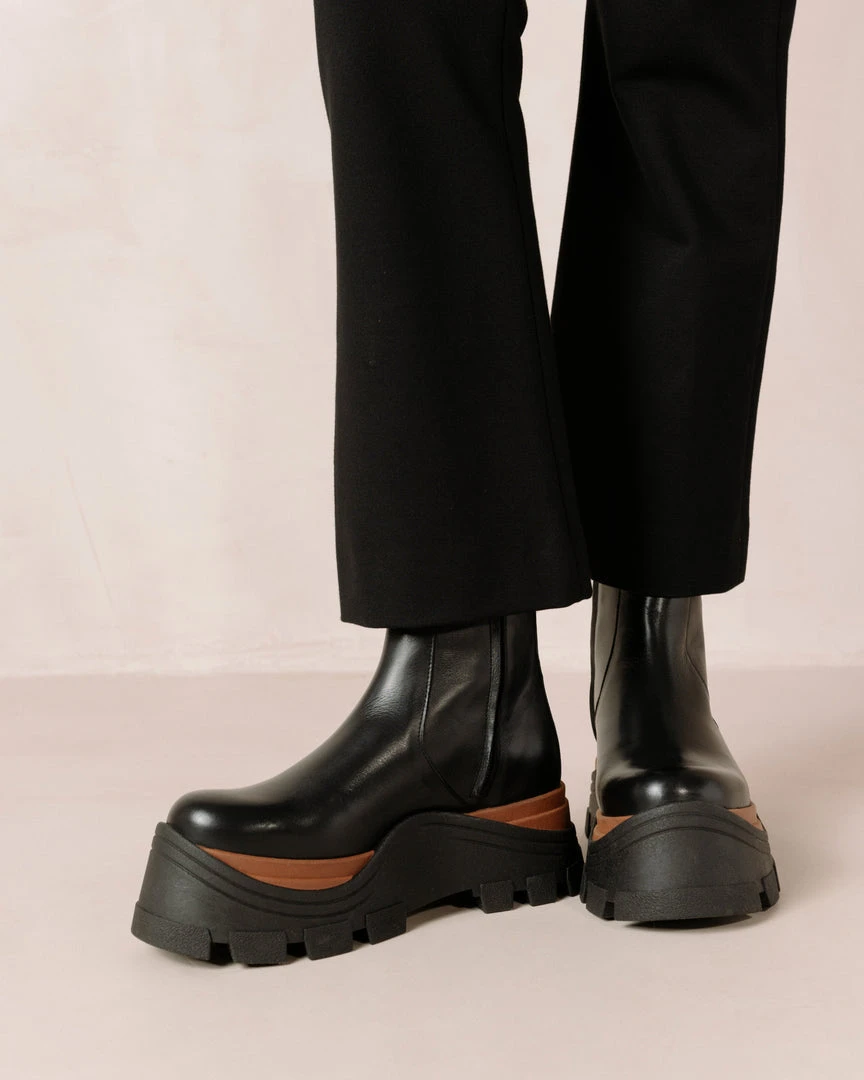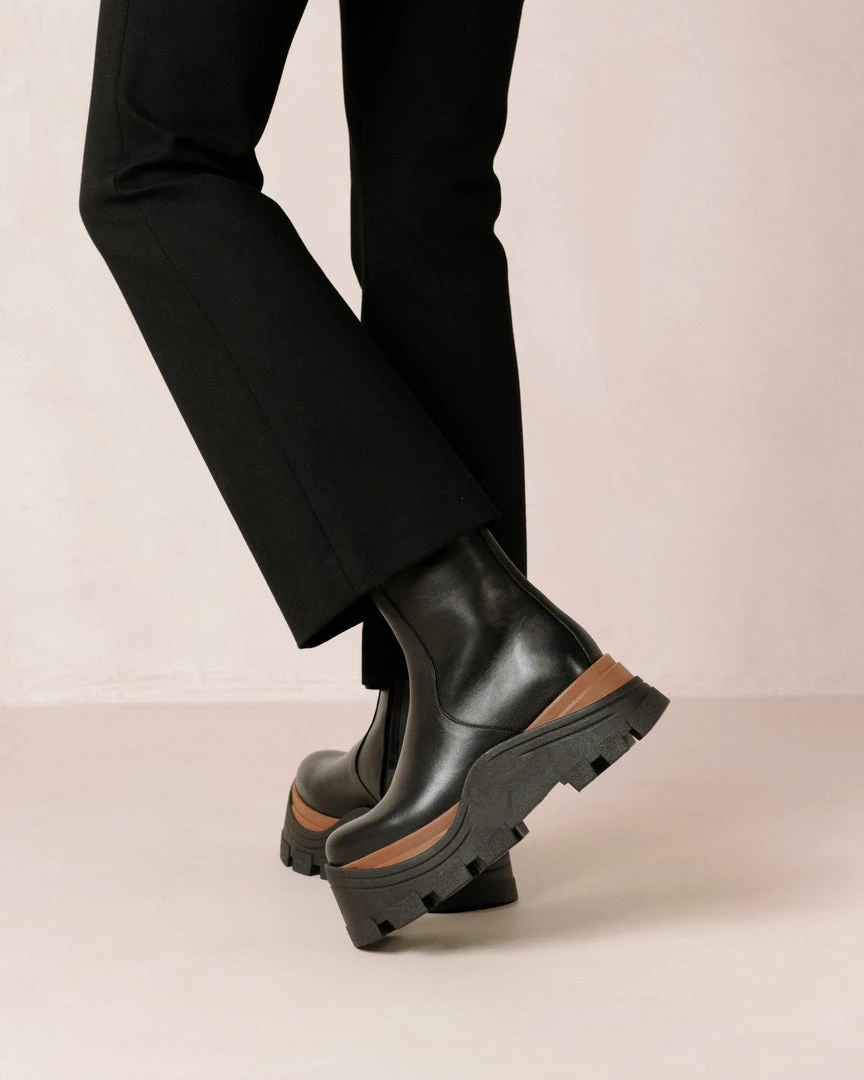 Low ankle chelsea boot with a thick track sole with an elastic side panel. The perfect companion for fall.