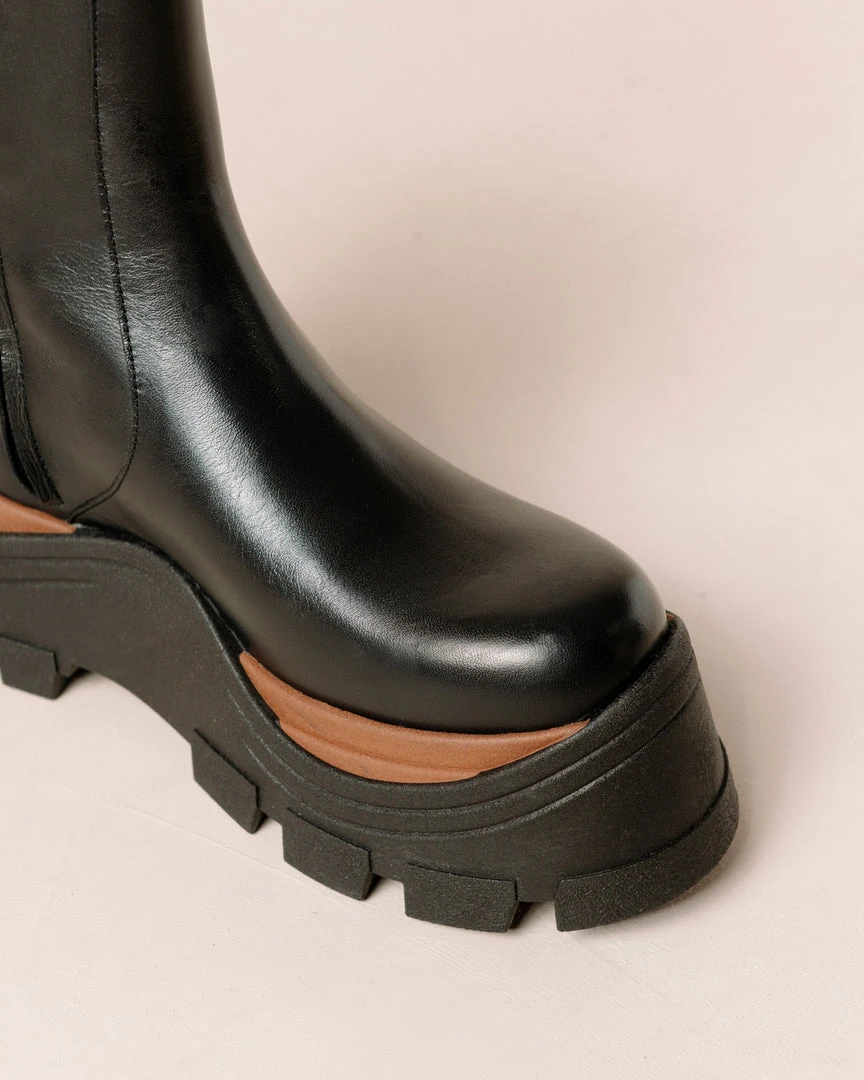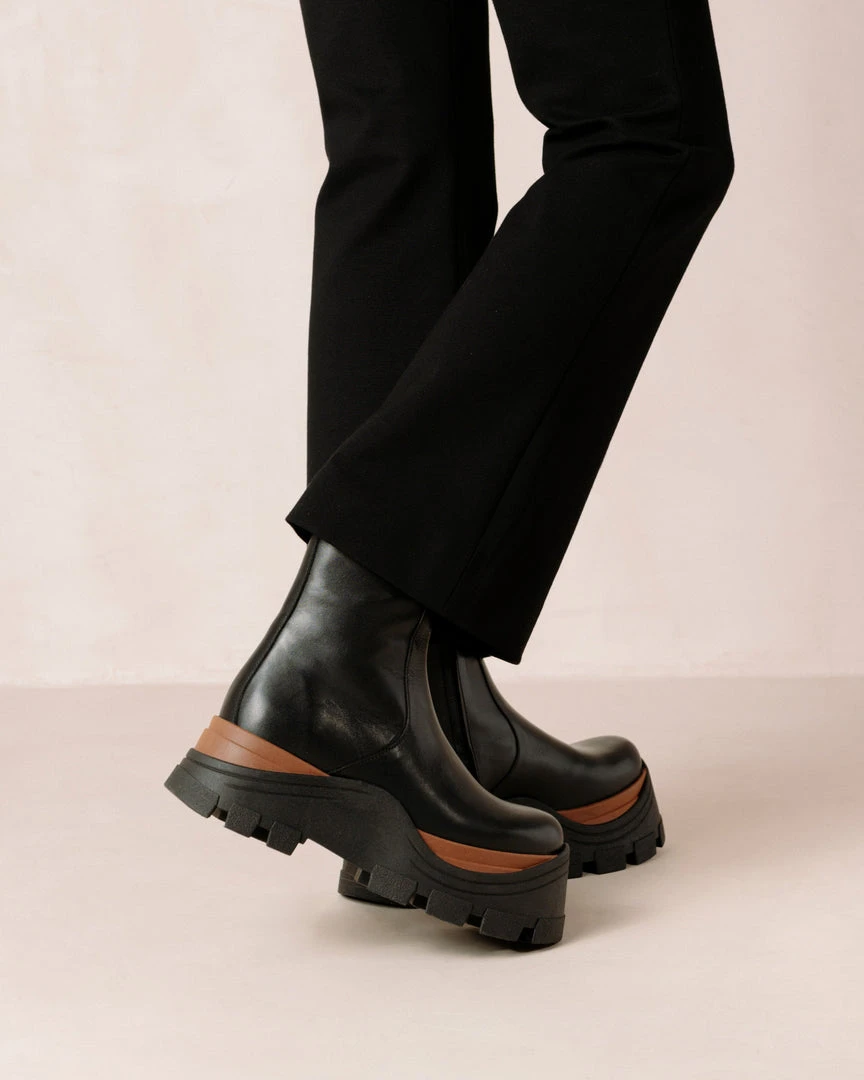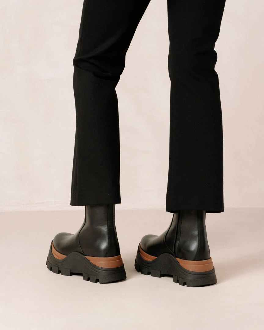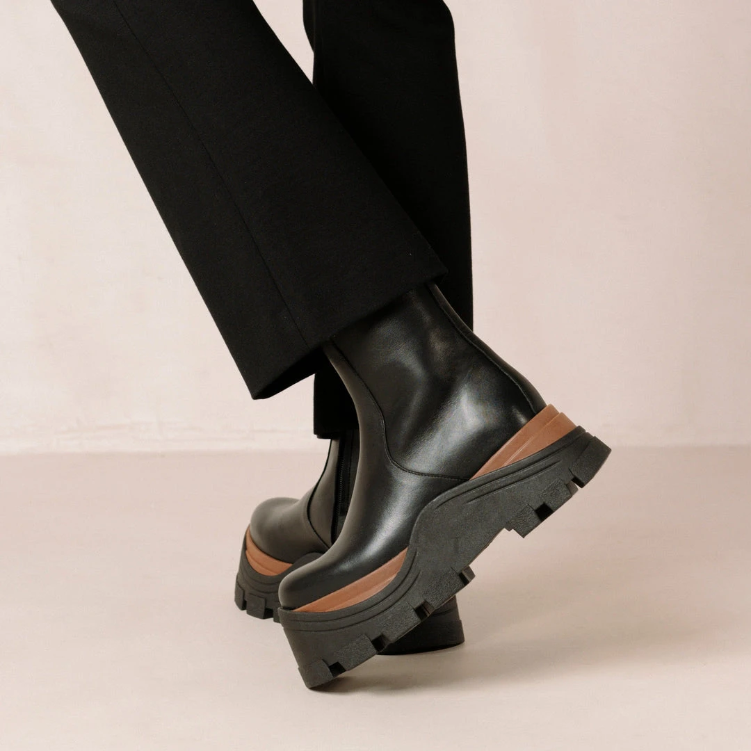 Low ankle chelsea boot with a thick track sole with an elastic side panel. The perfect companion for fall.
