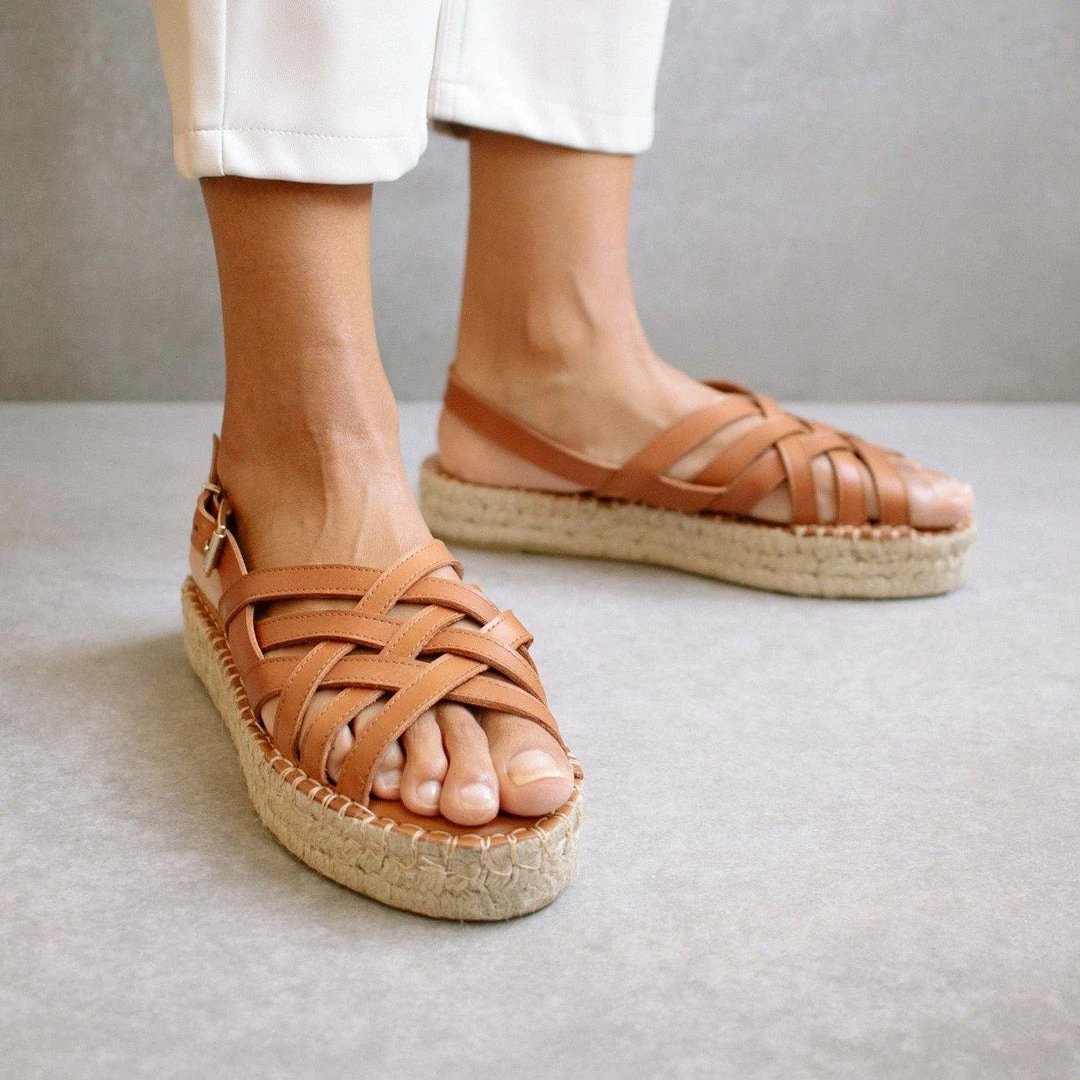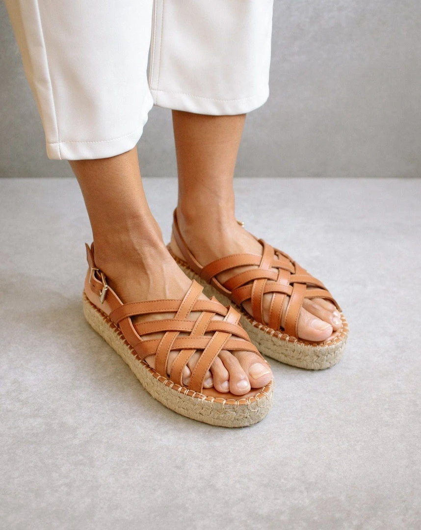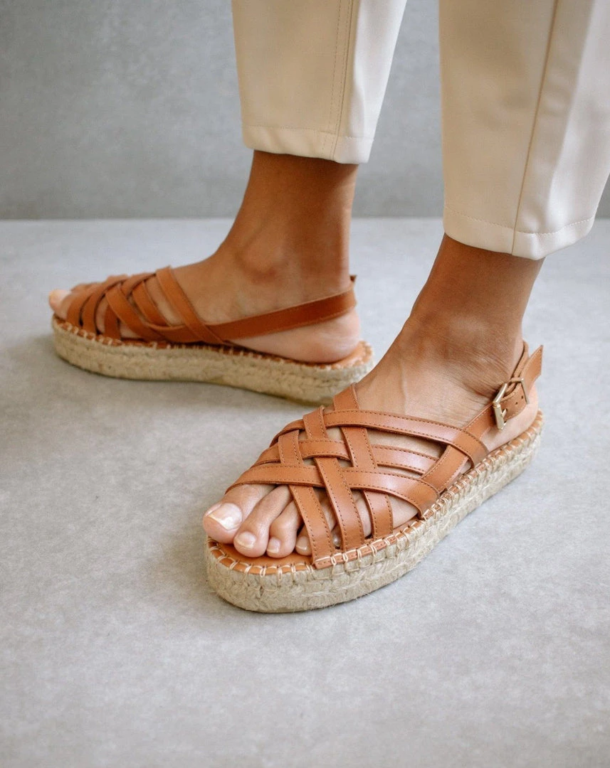 Anatomical platform made of 100% jute. Double straps criss crossed up front and a back ankle buckle hold.