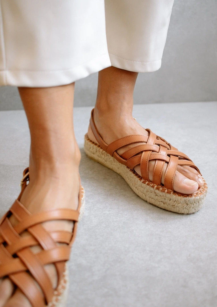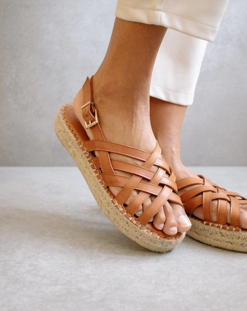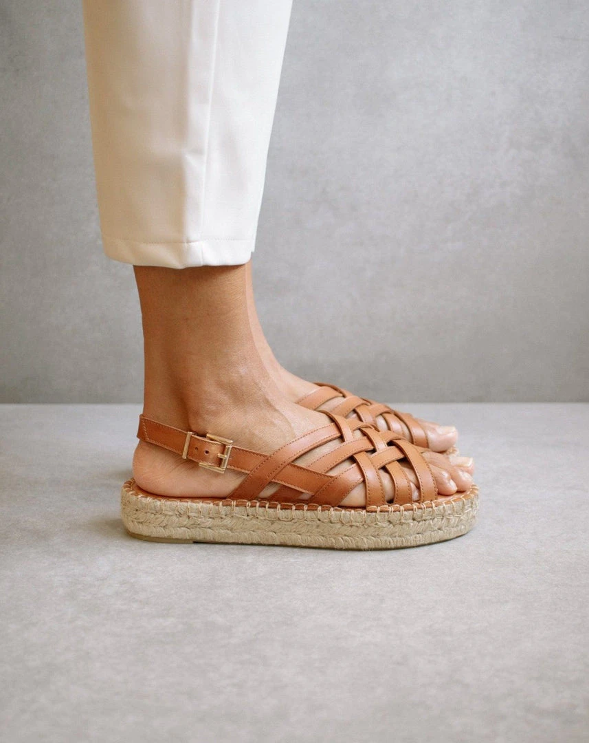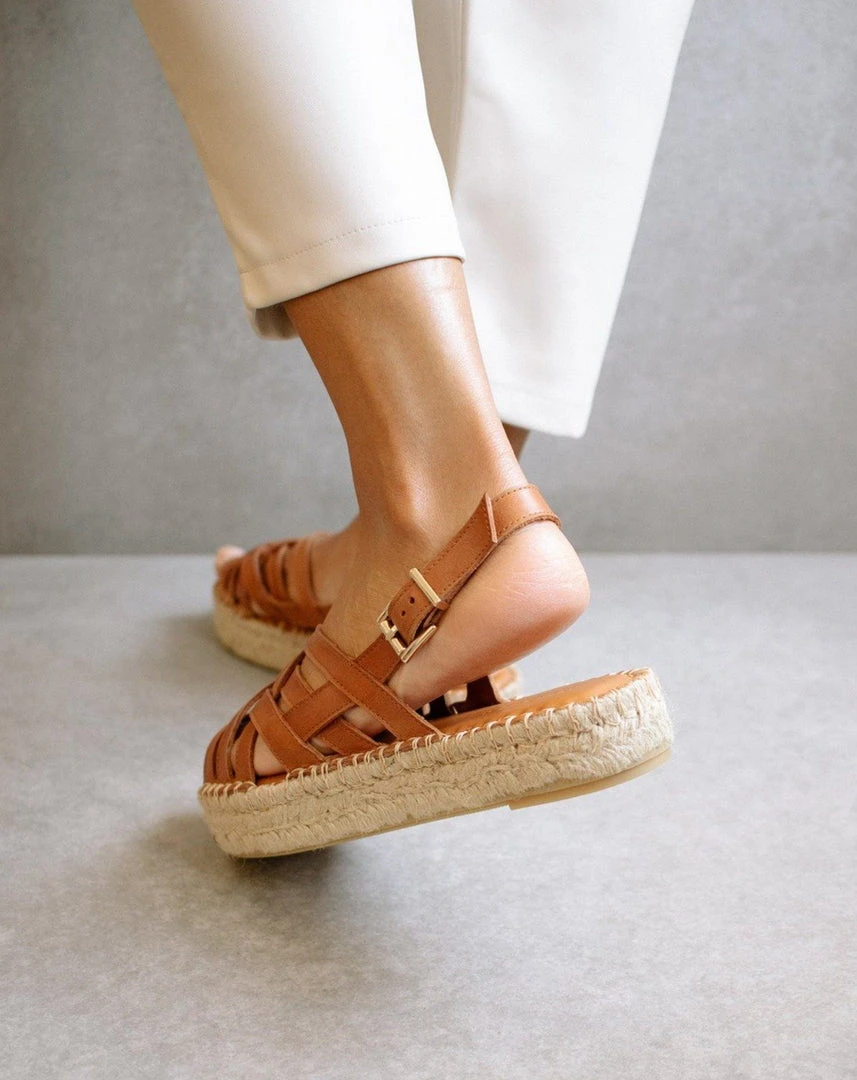 Anatomical platform made of 100% jute. Double straps criss crossed up front and a back ankle buckle hold.