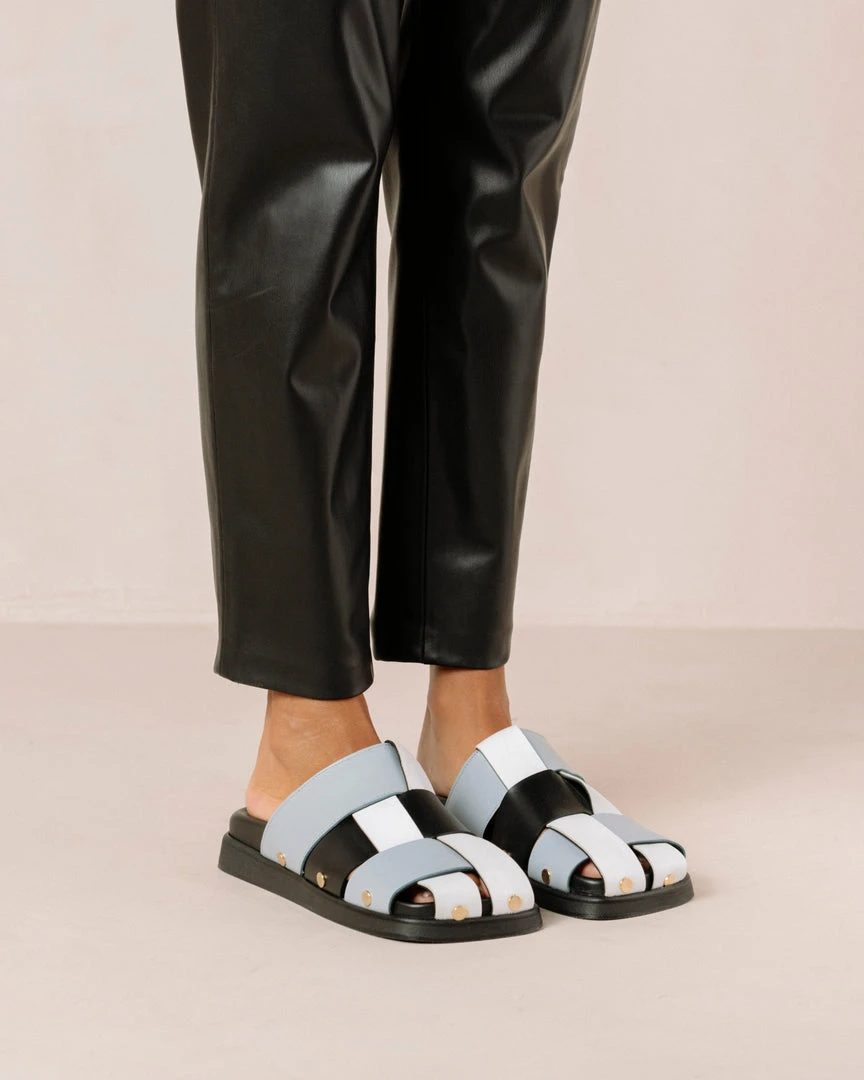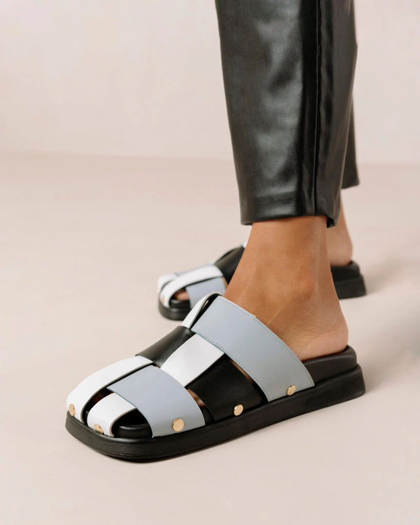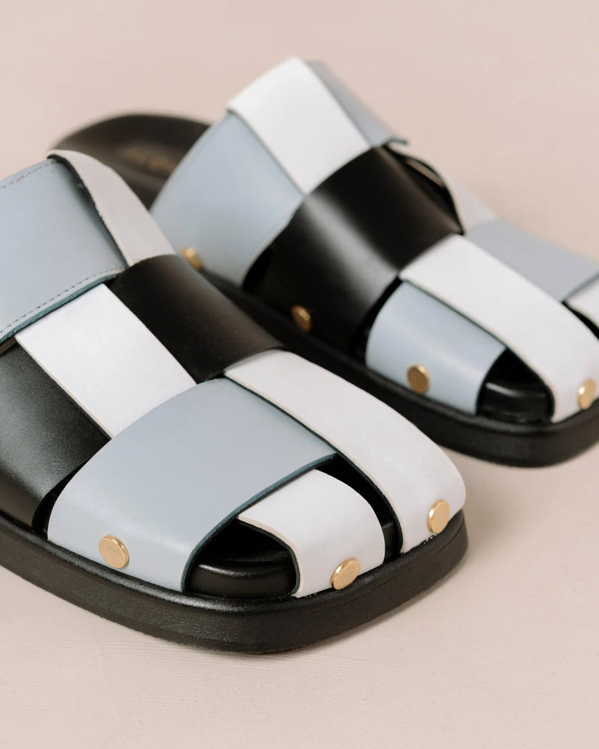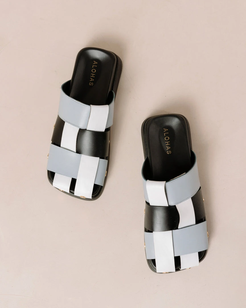 Square toed mules with a comfortably chunky sole and interweaving geometric straps. Make these the statement piece of your summer wardrobe.