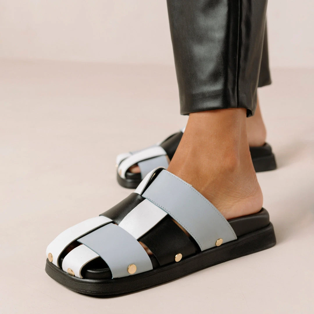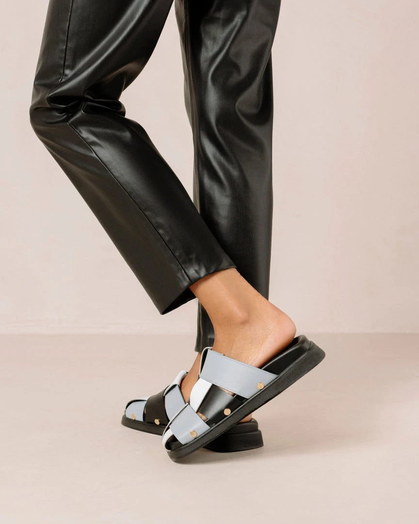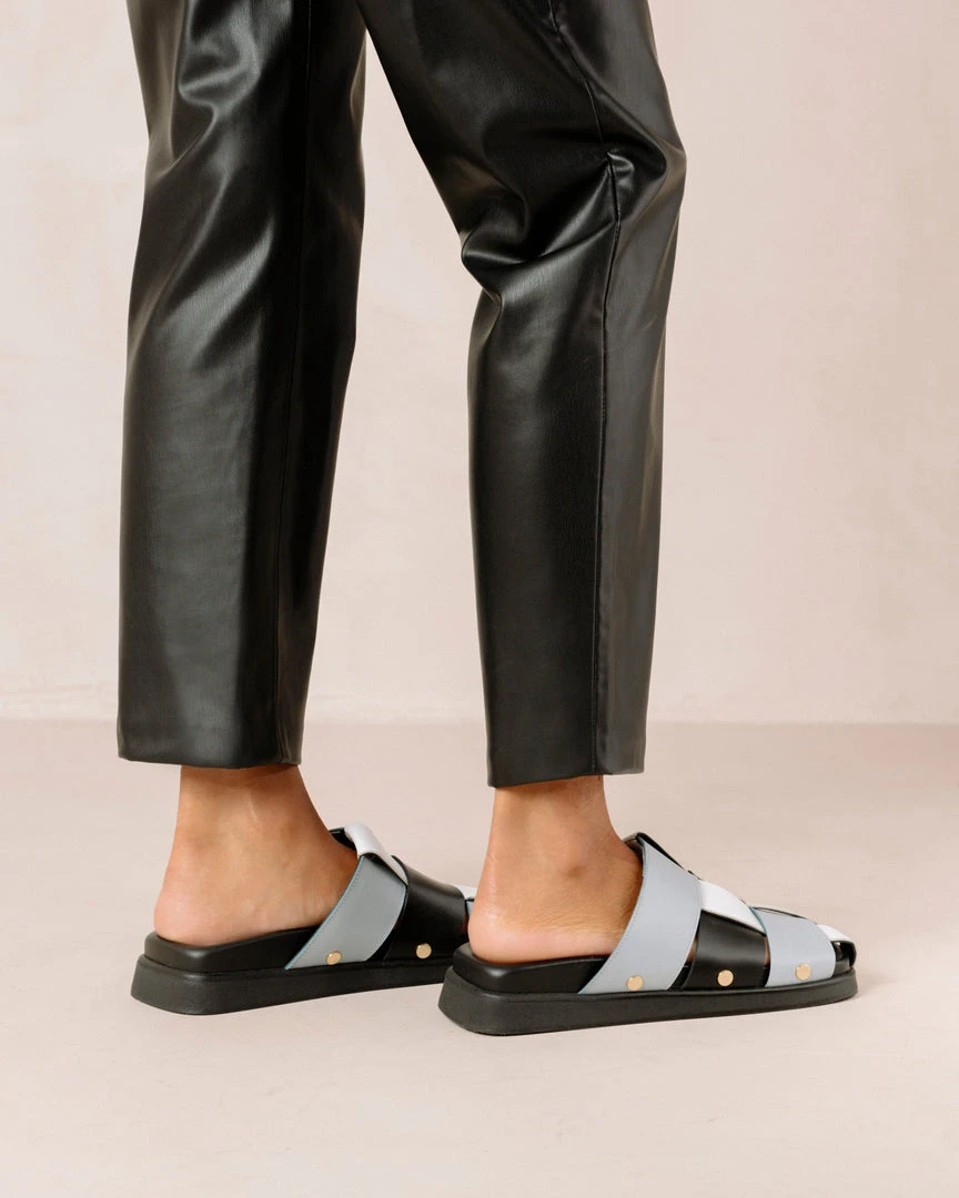 Square toed mules with a comfortably chunky sole and interweaving geometric straps. Make these the statement piece of your summer wardrobe.