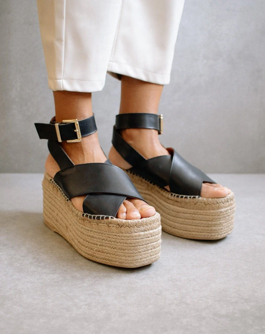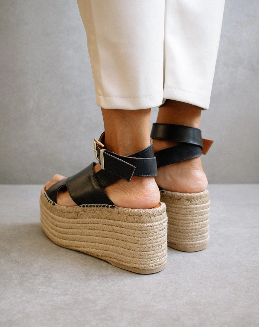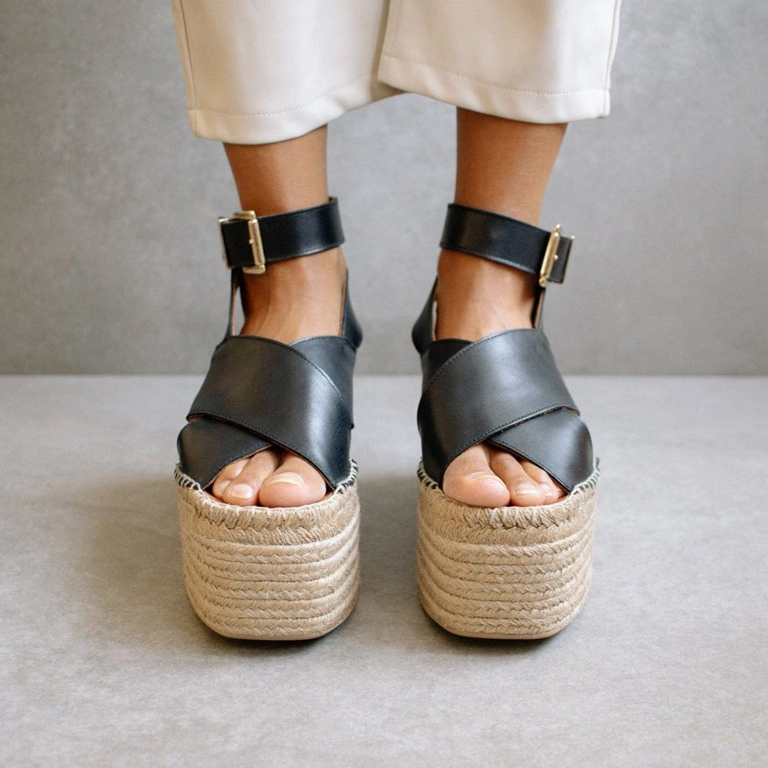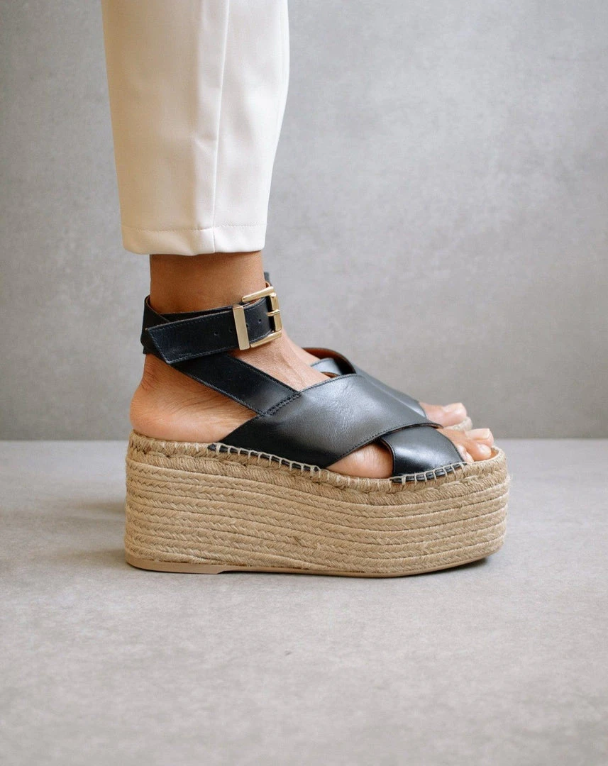 Maxi platform made of 100% jute. Thick criss cross straps and strong buckle hold around the ankle.