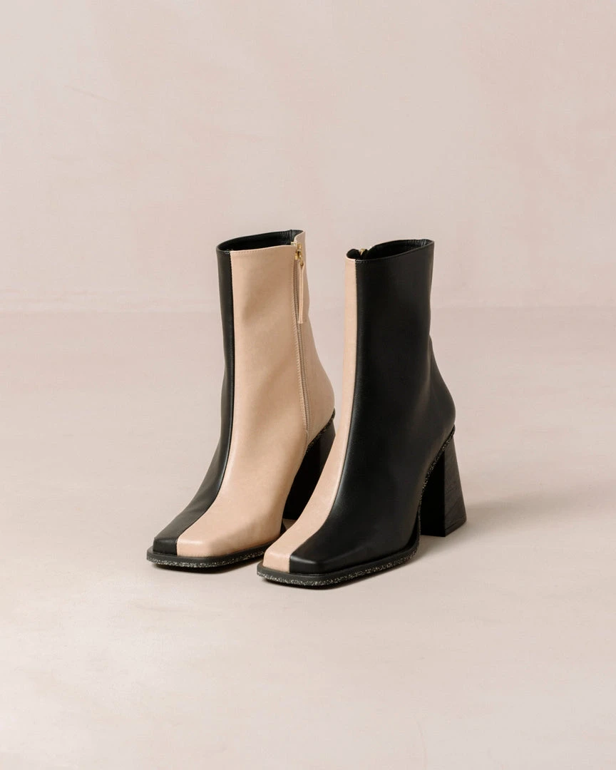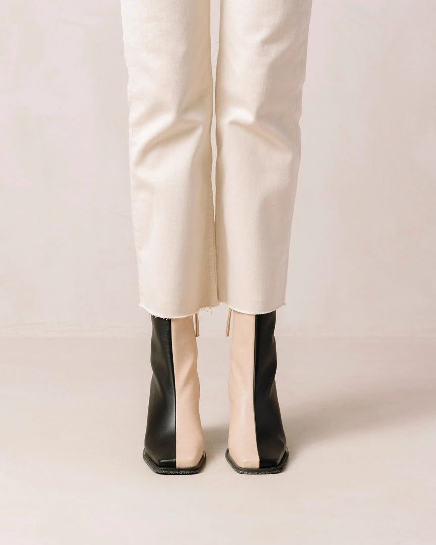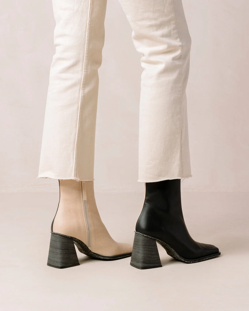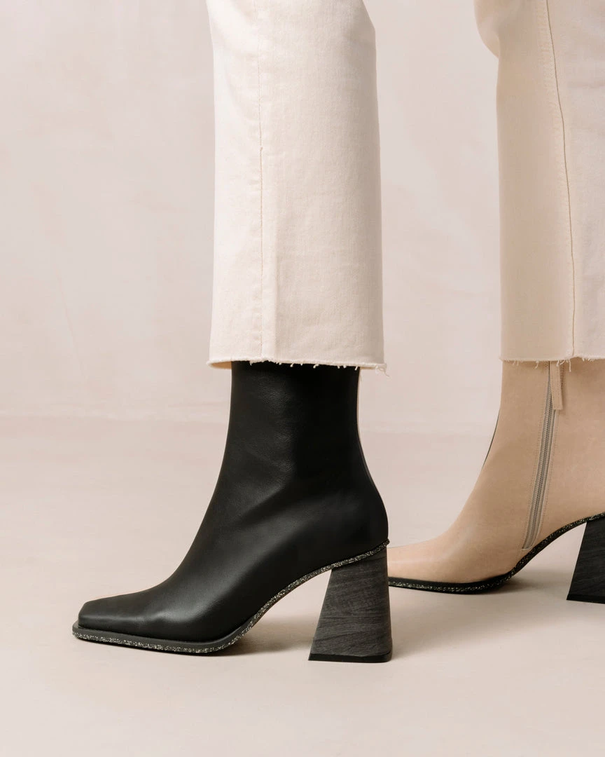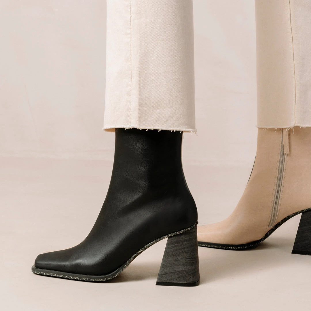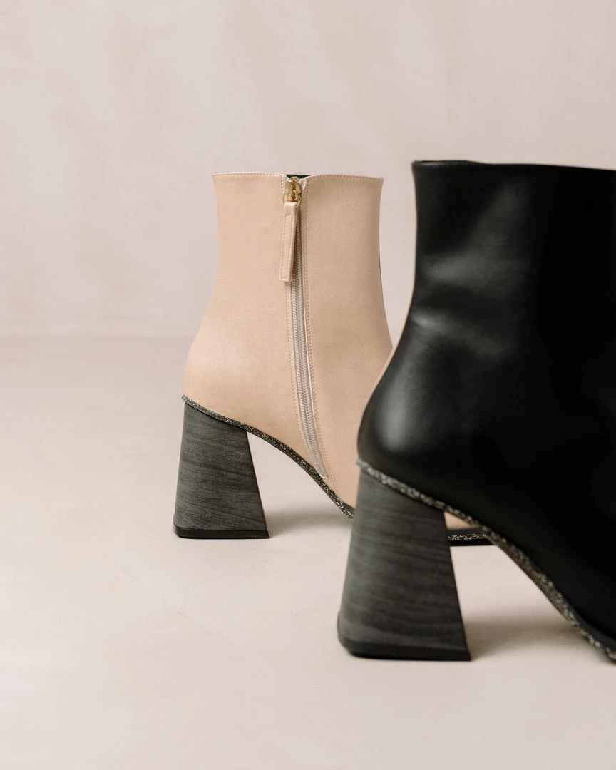 Get the quintessential 90s look with the wide block heel on this slim ankle boot. Zips along the side to elongate the legs and create a flattering silhouette. Heel, cap, lining all made of recycled materials.