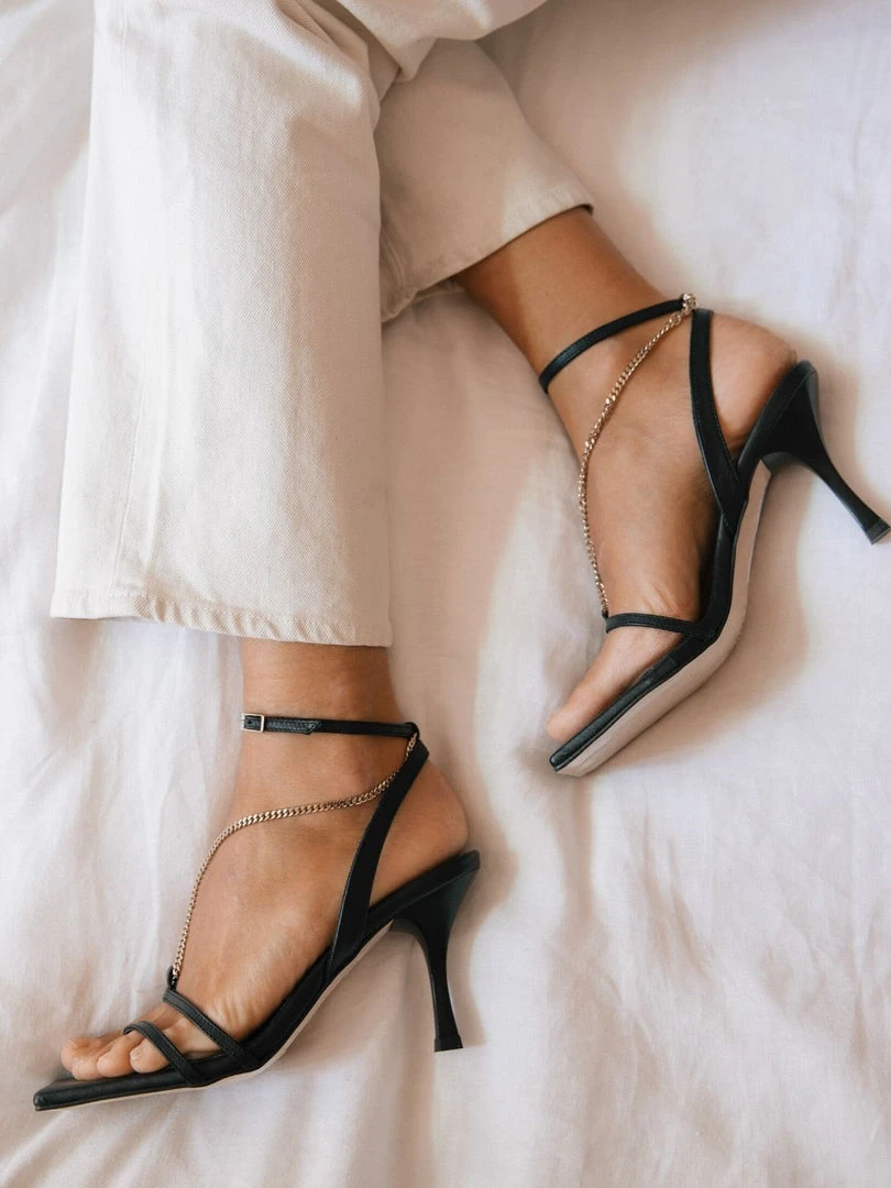 It’s not the 90s without some gold chains. These sustainable leather sandals feature two front straps, one that leaves the big toe elegantly bare; the other linking to an exquisite gold link chain that reaches up to ankle height. Square toe and an extra ankle buckle strap to adjust fit. Their low kitten heel gives it a sophisticated yet minimalist, barely there look that appeals to any and every age group.