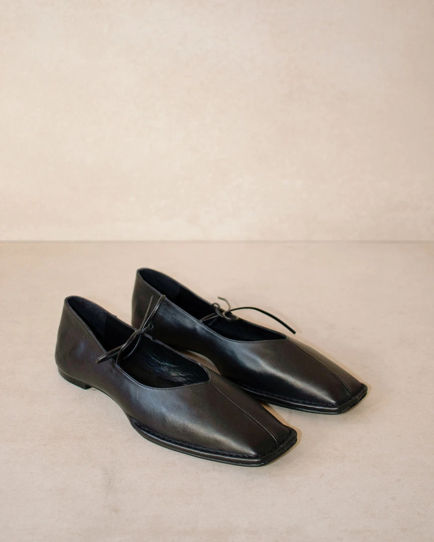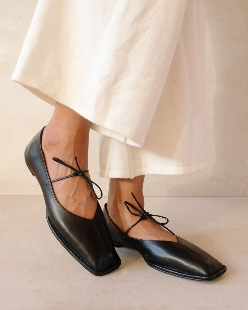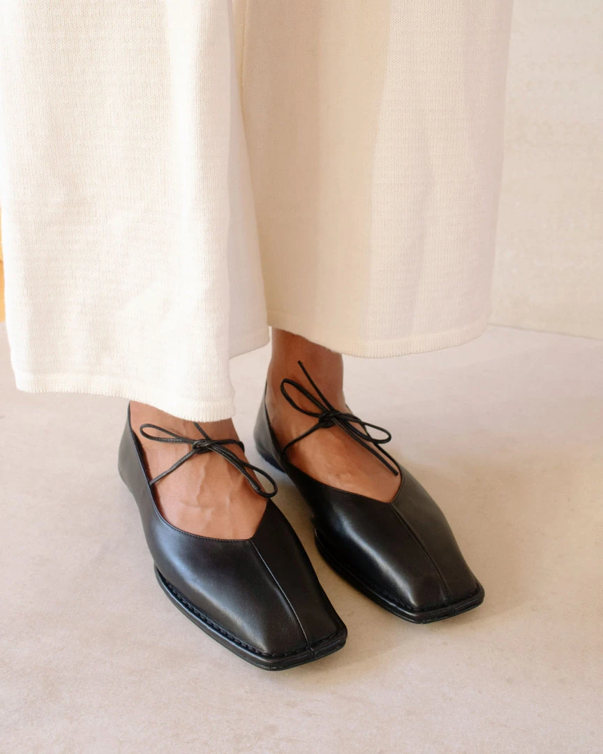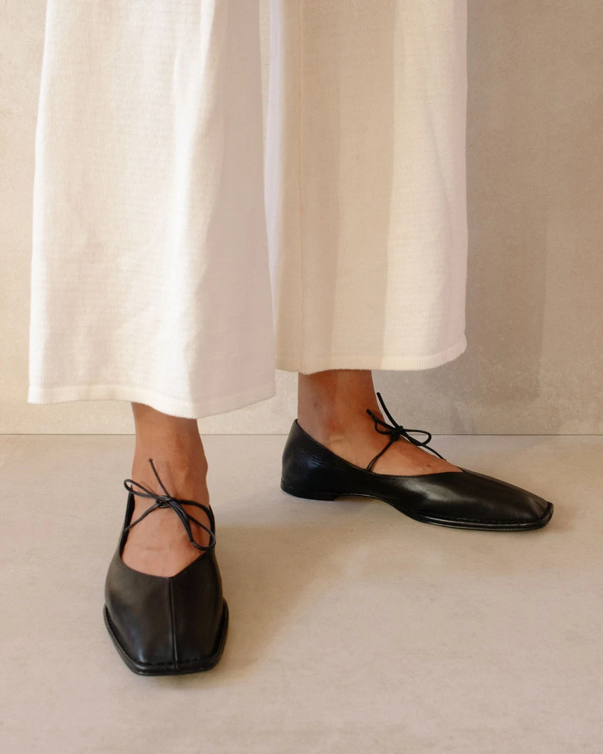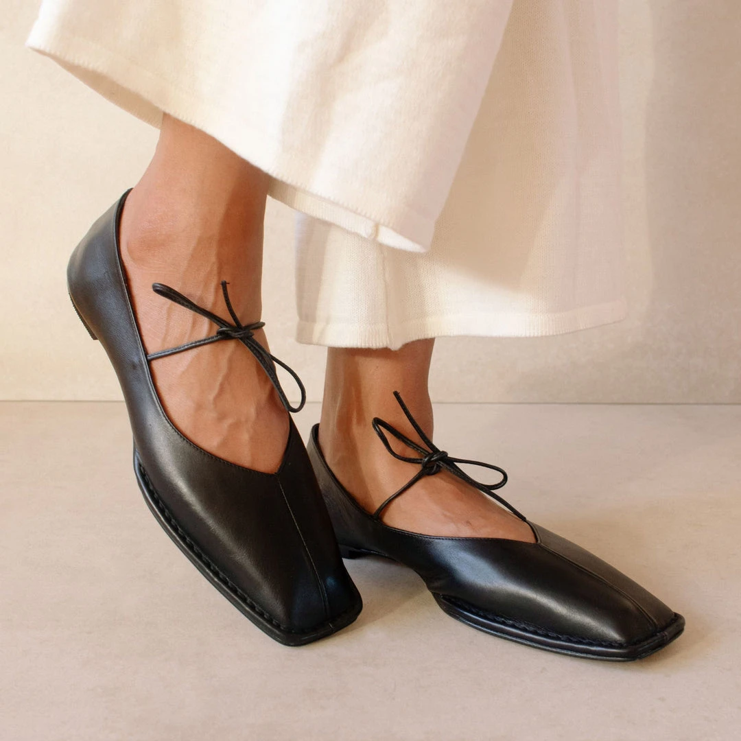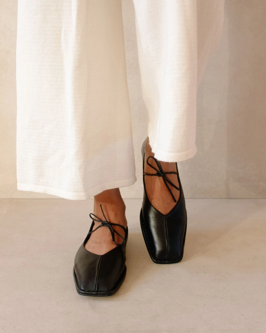 Ballet flats featuring a stylish square toe. Flexible sole designed to offer greater comfort and a front string-bow for a special touch of ladies who lunch.