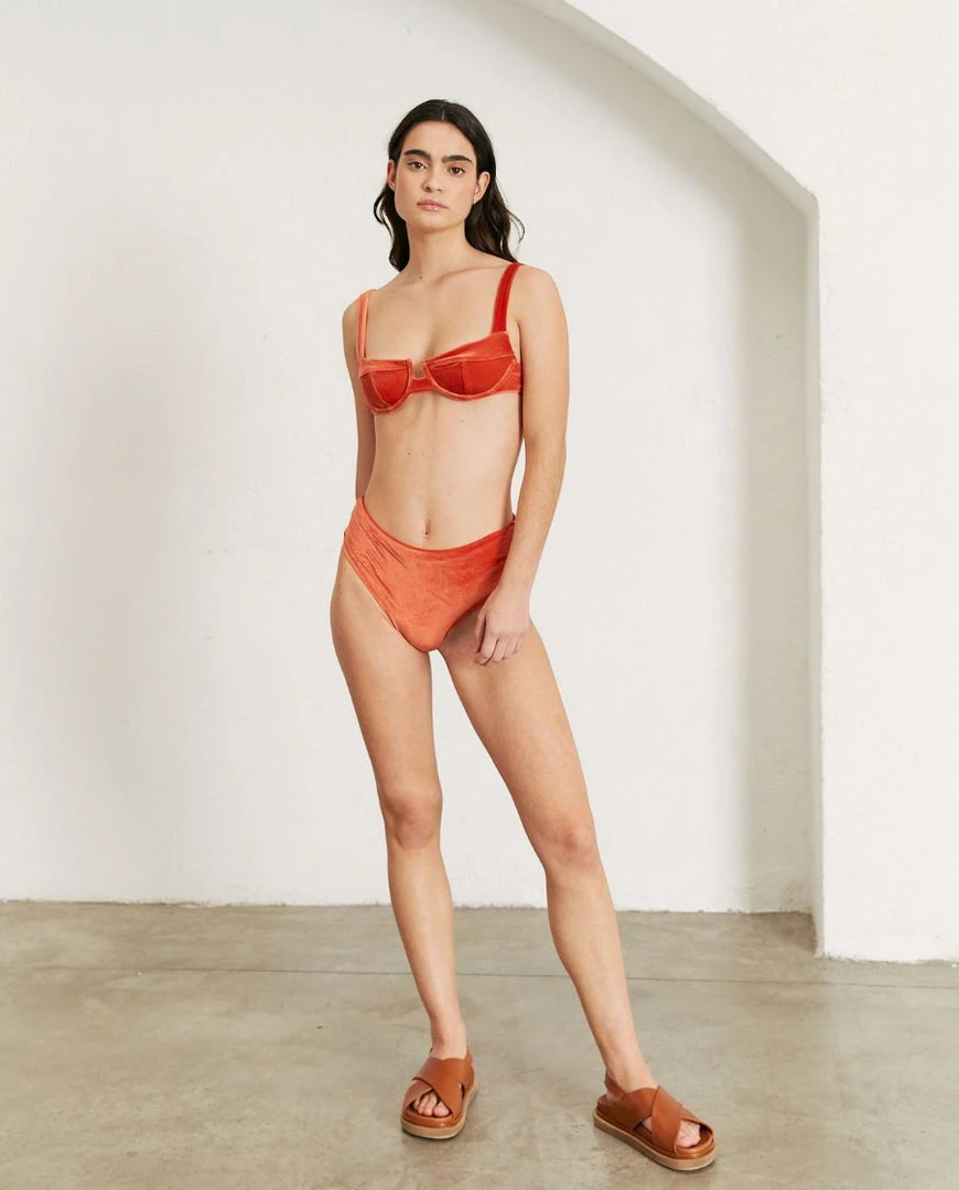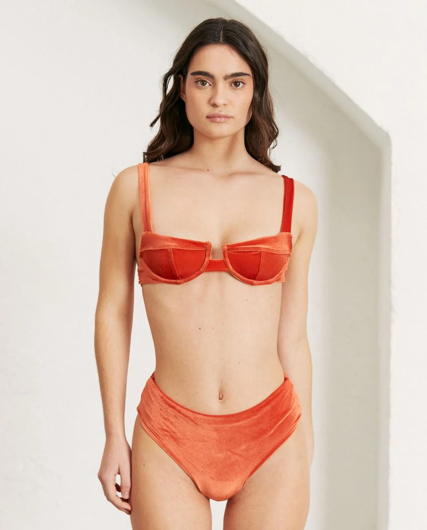 We wanted to keep you in the loop about our latest swimwear, so we came up with this iconic piece. A balcony bra style bikini top with minimalistic stitching for the ultimate beach babe look. Best combined with the Pentagon Velvet bikini briefs.