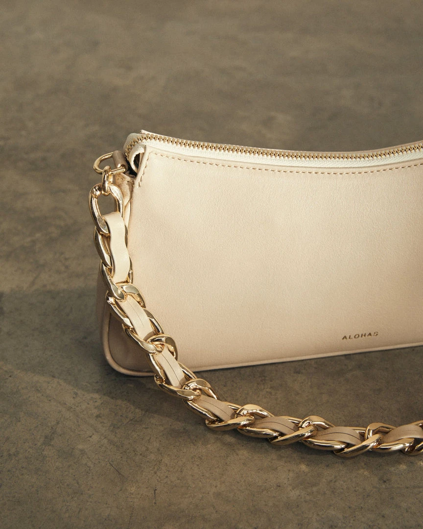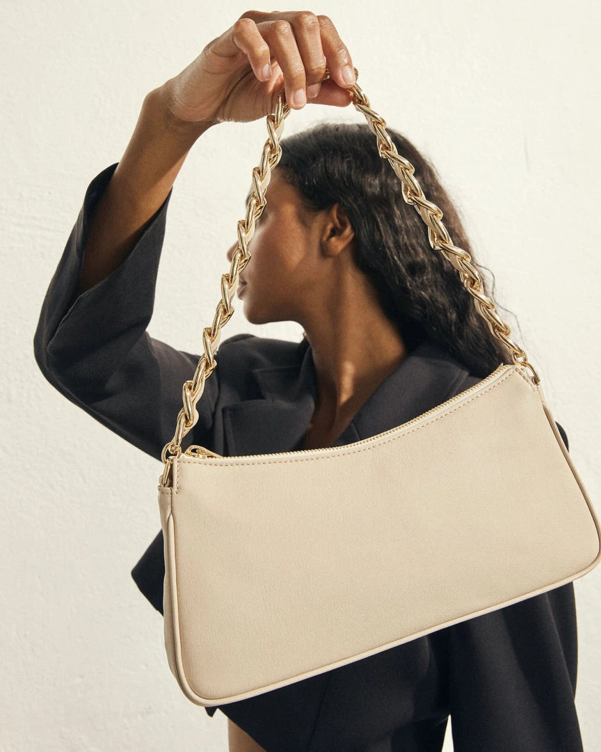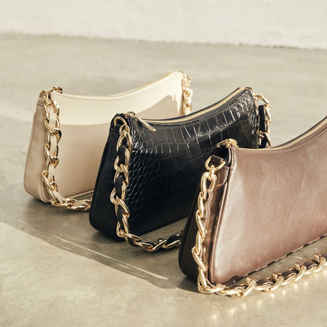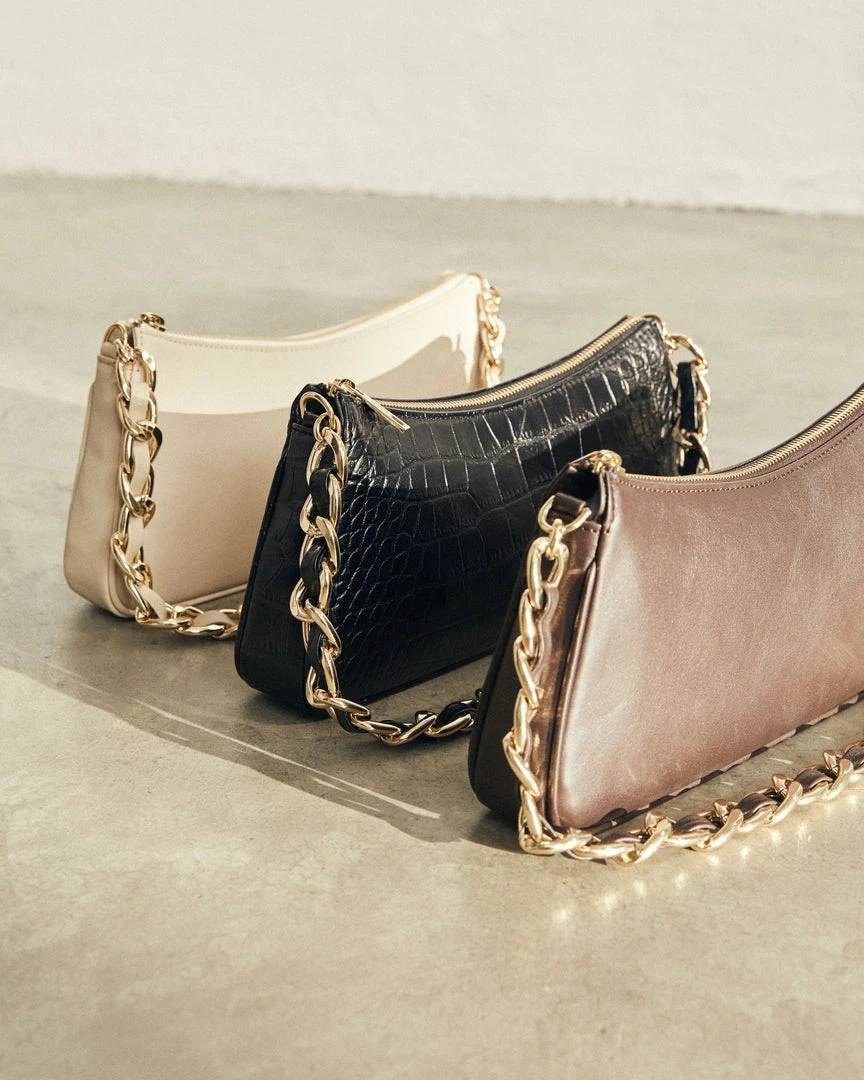 The S bag features a gold-tone chainlink shoulder strap and a cow-leather squared body. Wear out to dinner with matching ankle boots.