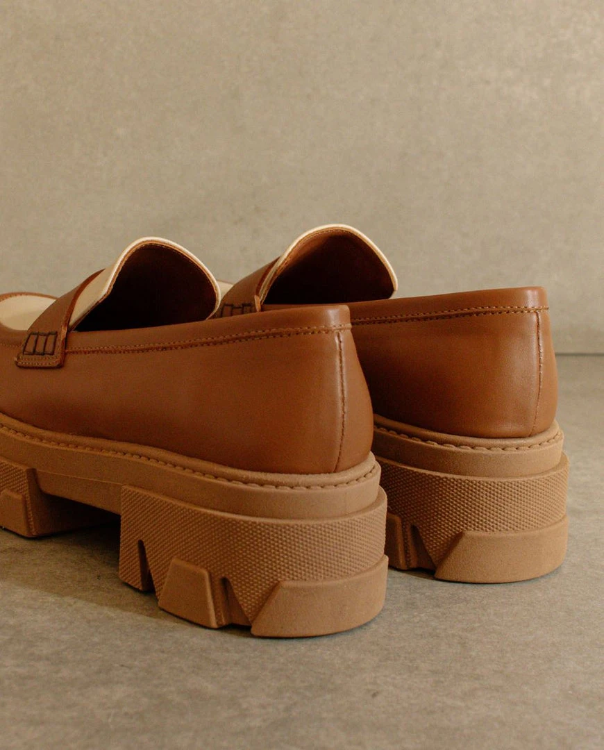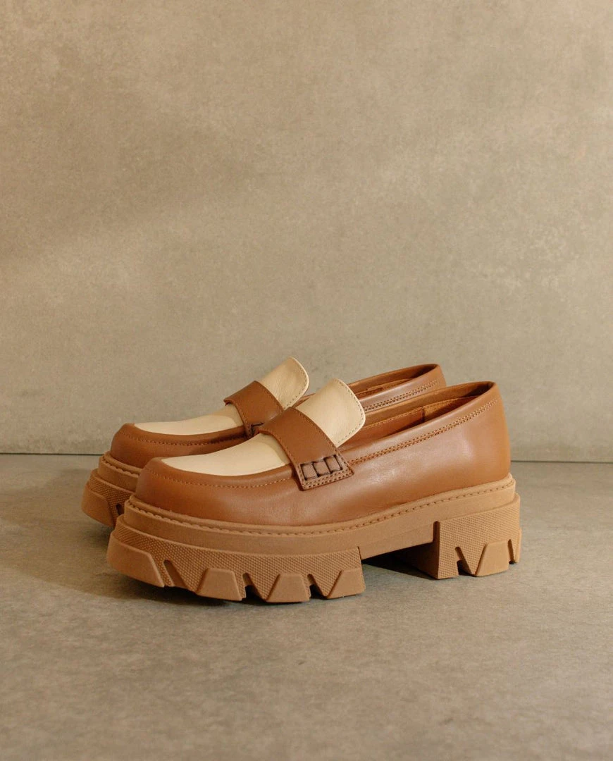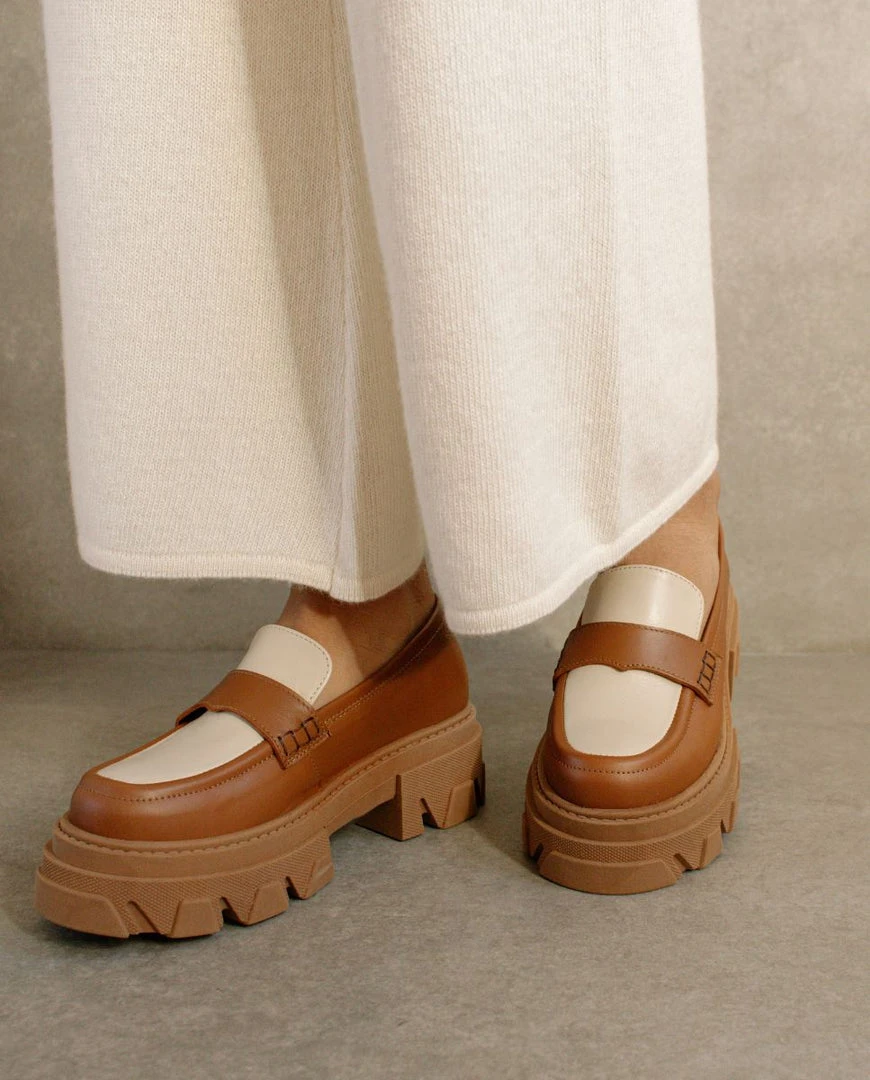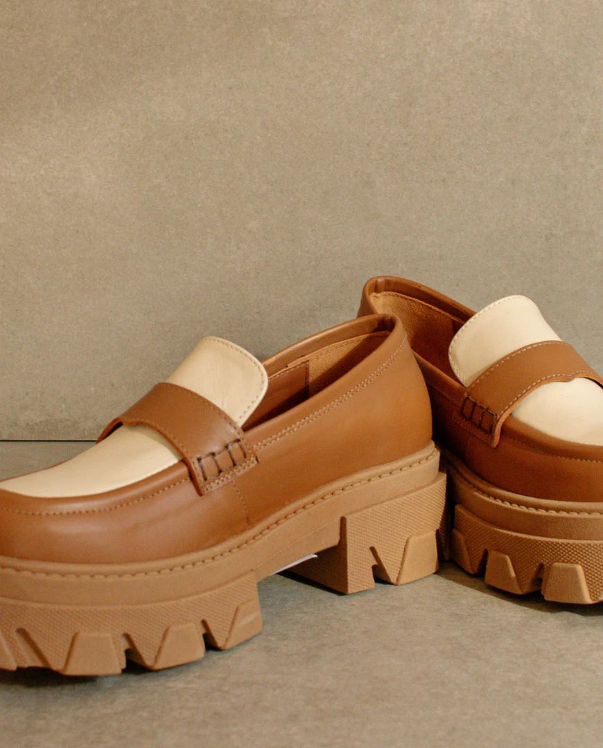 Moccasin silhouette elevated by a thick track sole. A structured look and comfortable slip on style with classic school uniform vibes.