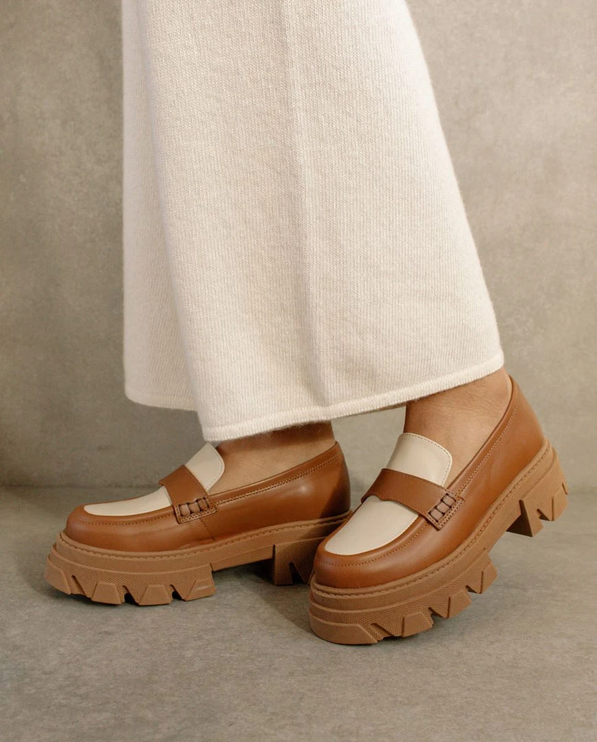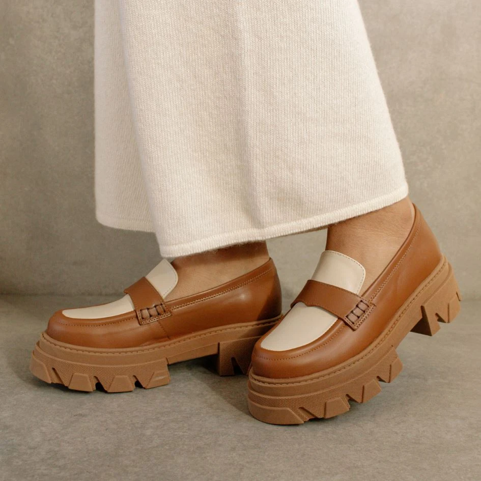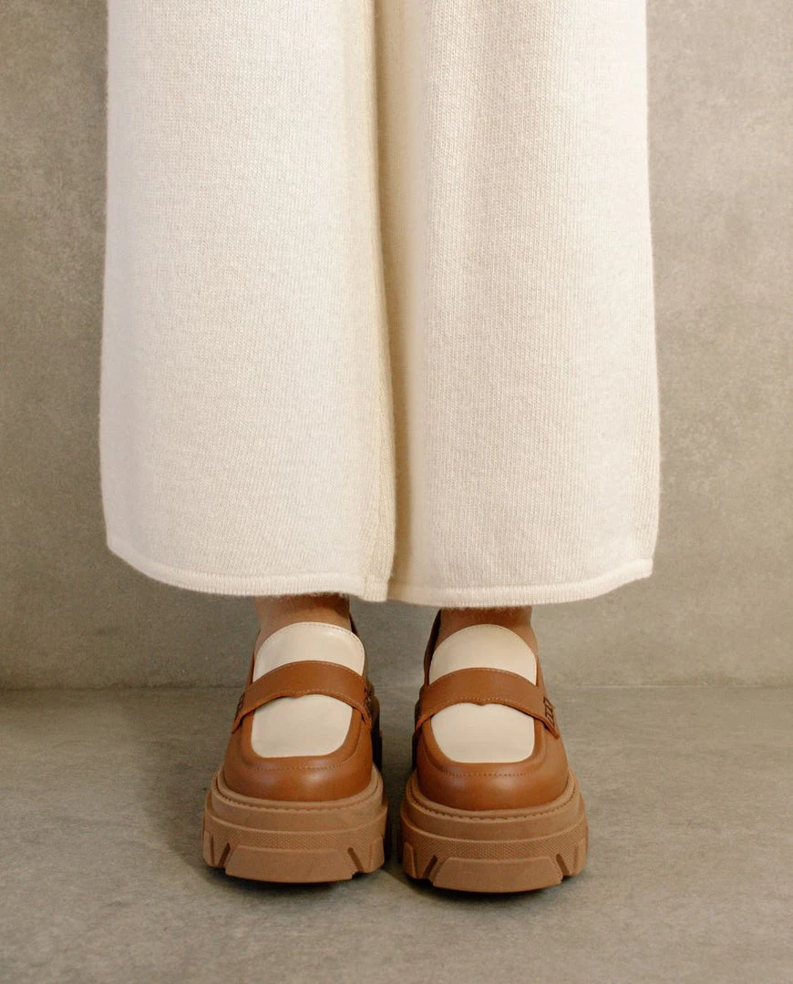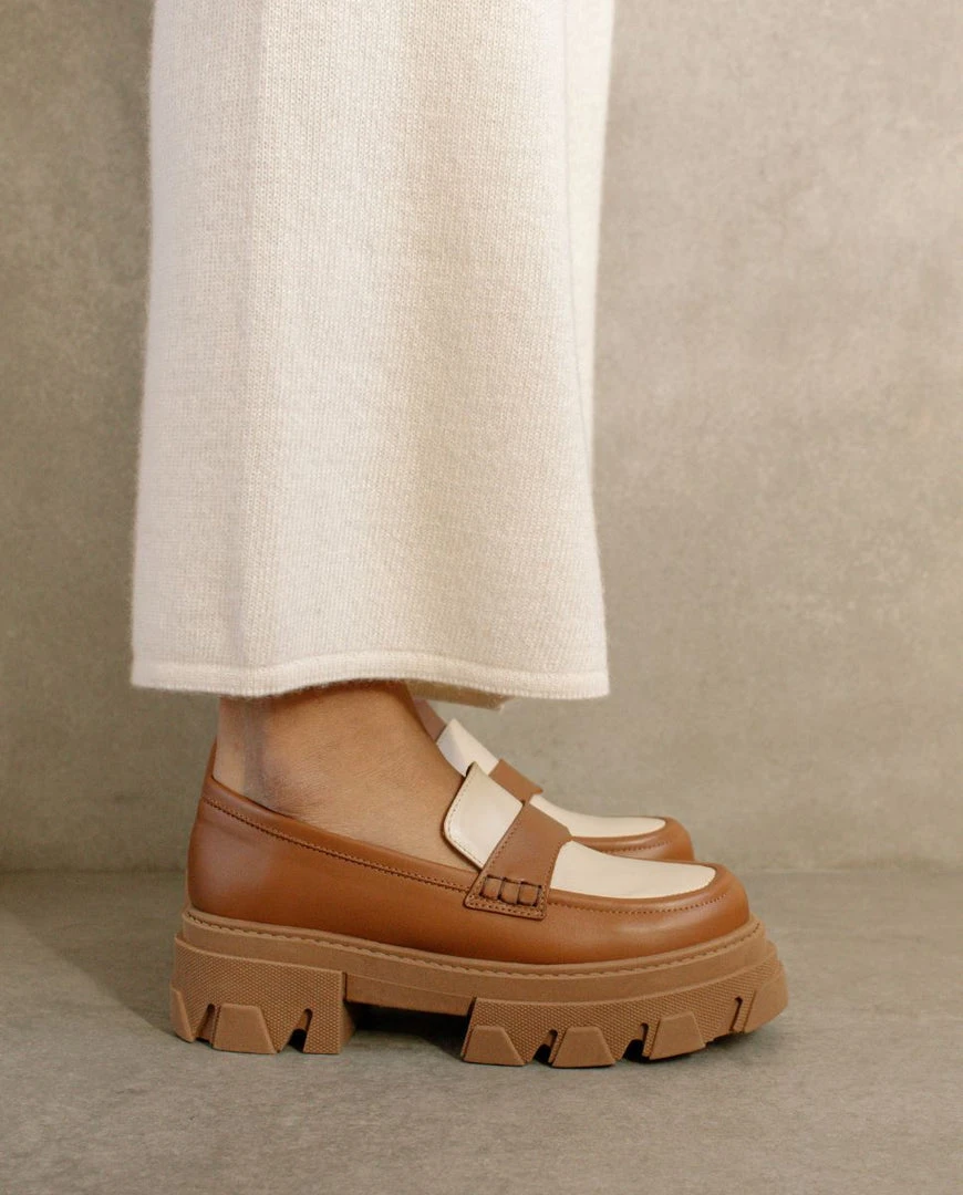 Moccasin silhouette elevated by a thick track sole. A structured look and comfortable slip on style with classic school uniform vibes.