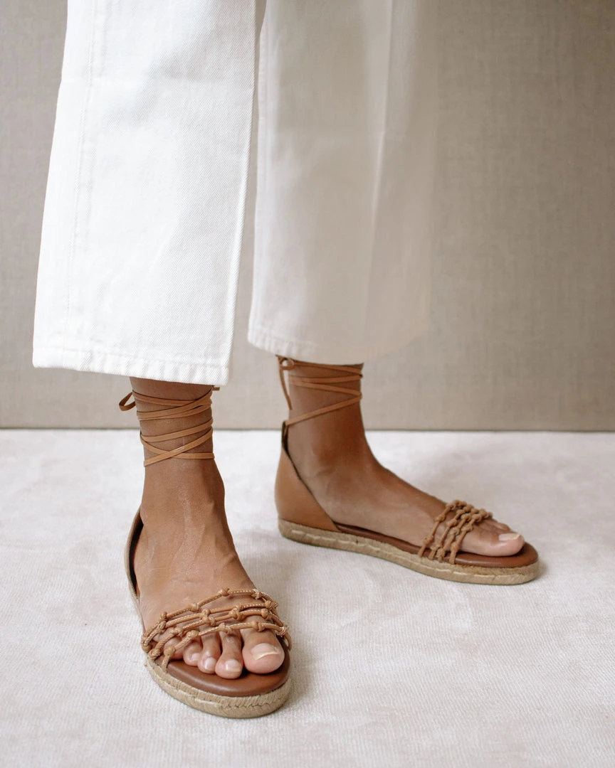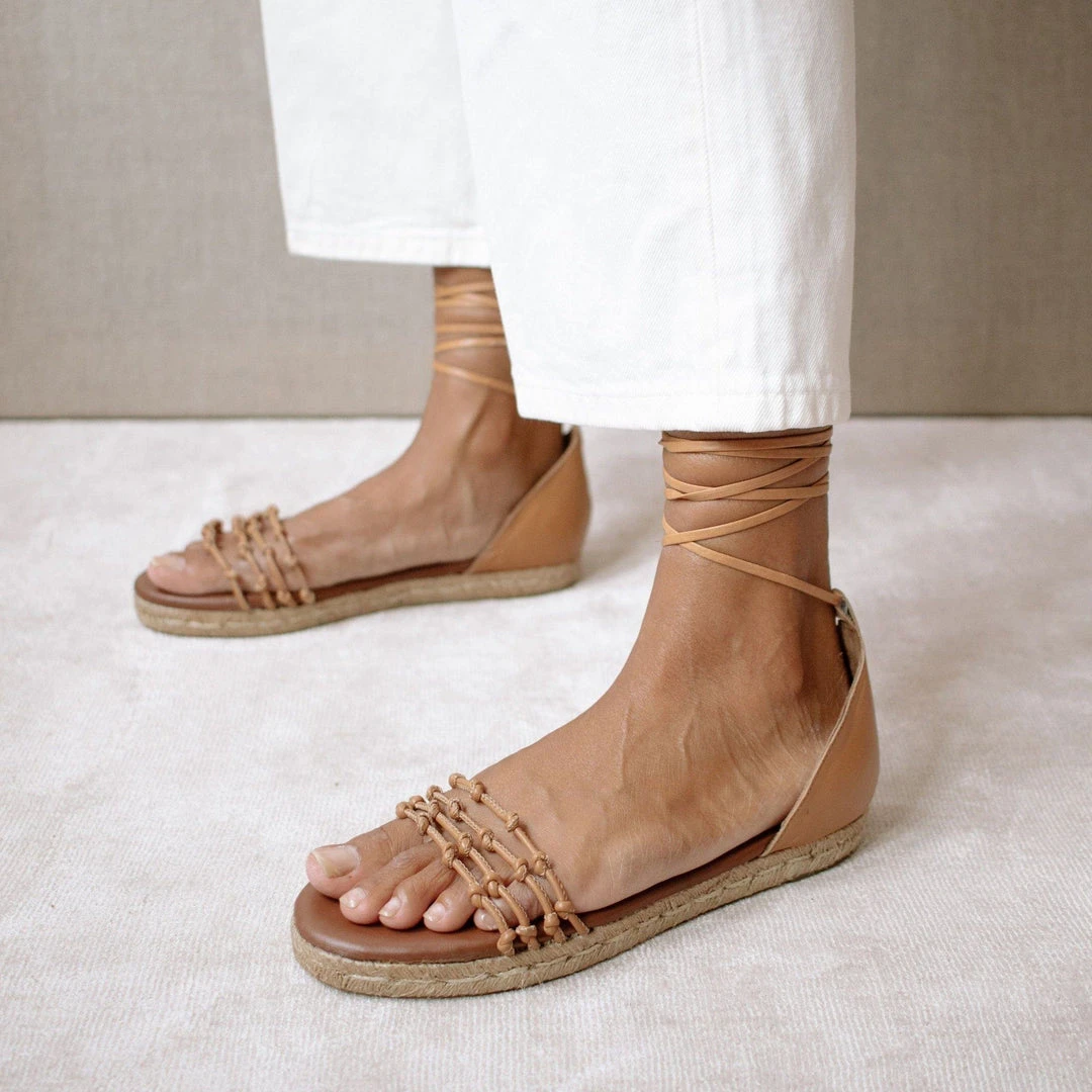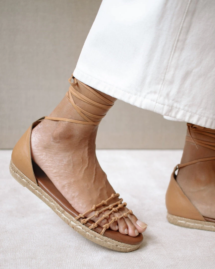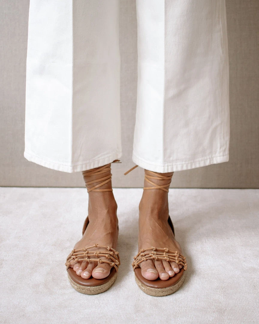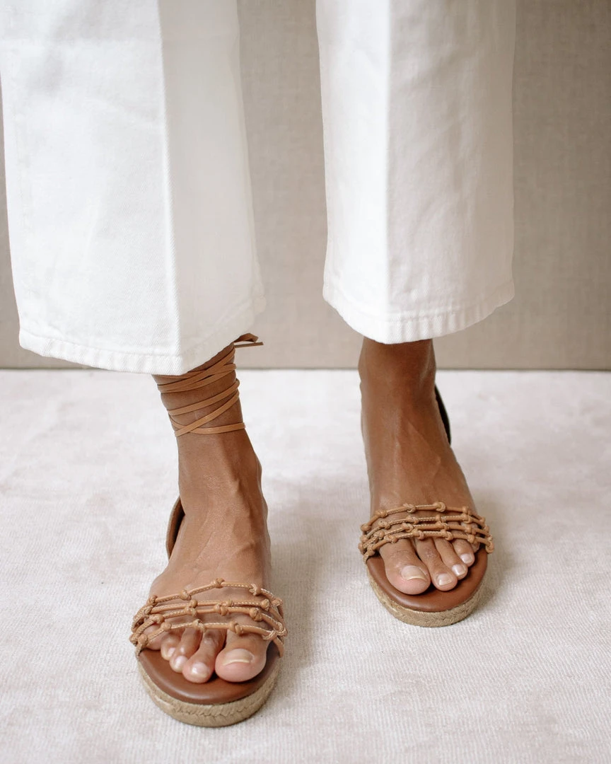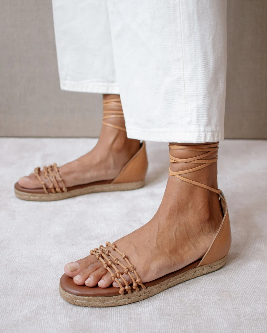 Featuring four thinly knotted front straps on a round-toed espadrille sole. Laced up the ankle by a thin criss cross strap.