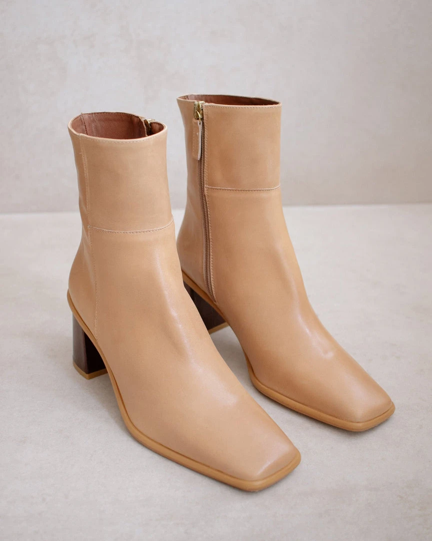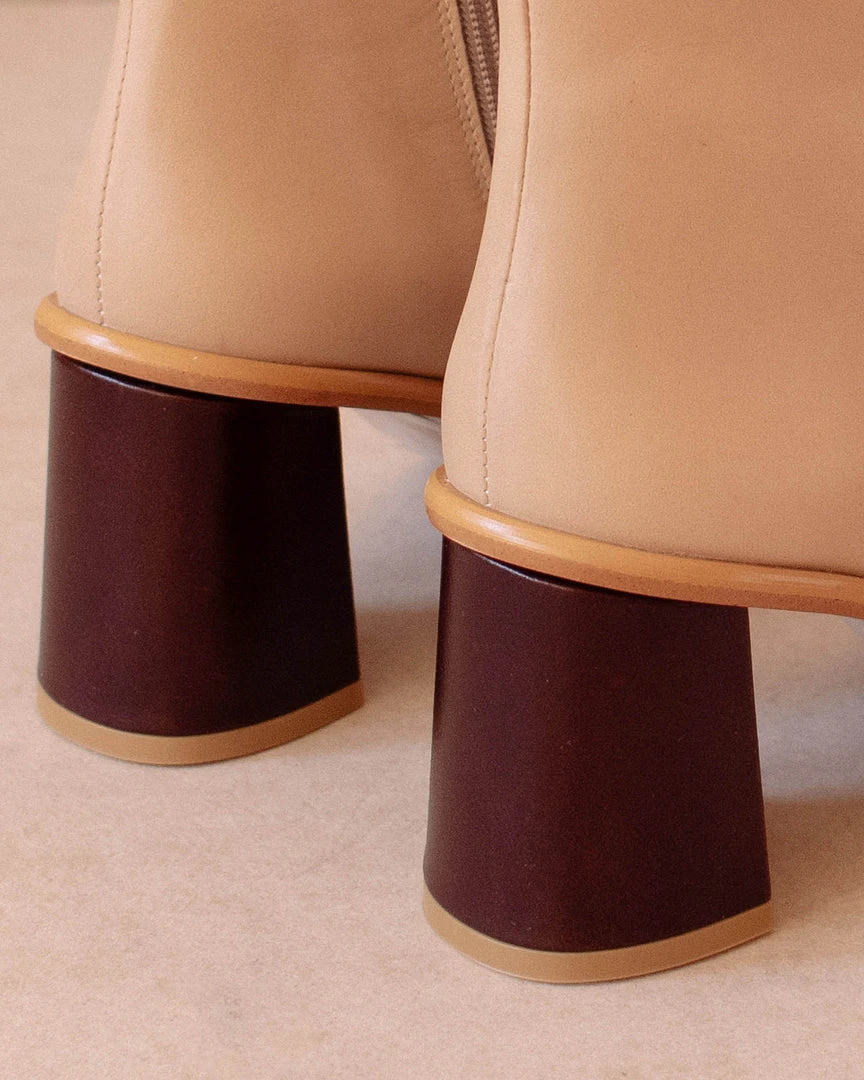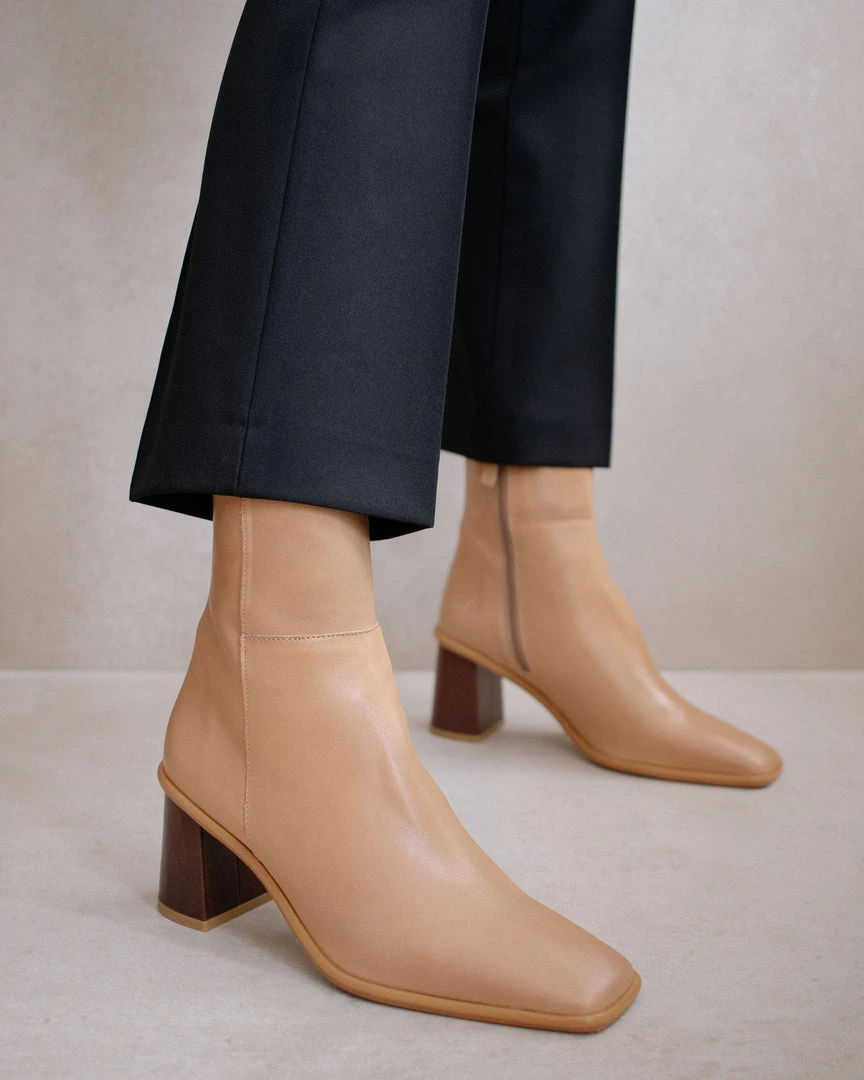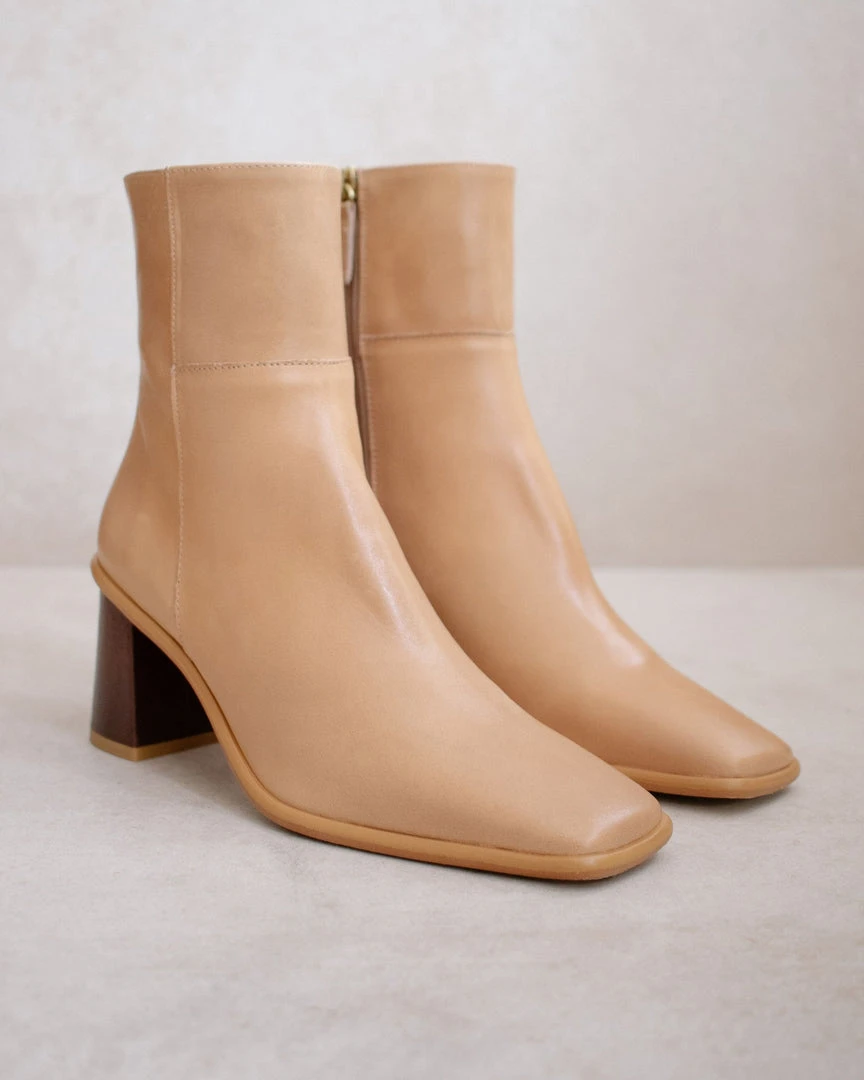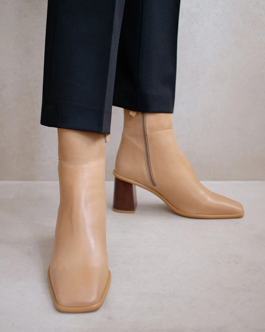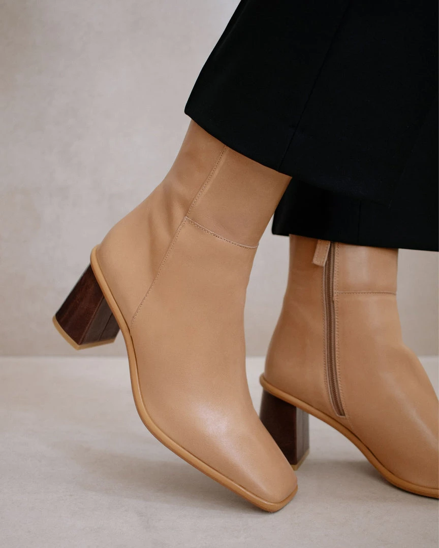 If you don’t know where to go, go West. These ethical leather boots have a wooden effect heel, a square toe and a light camel colored outer sole. They also feature inward facing zippers with brown leather zipper pulls for extra comfort and feature a flattering, slim fit. Glossy leather finish.