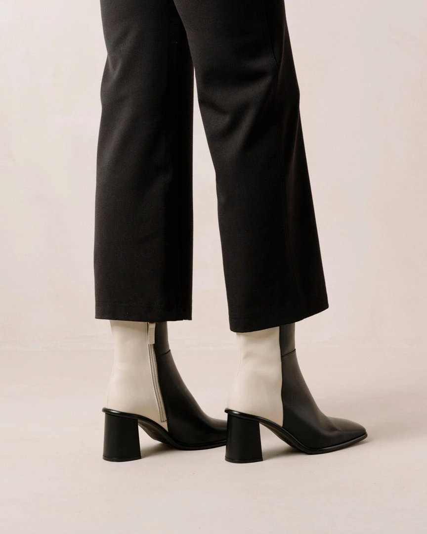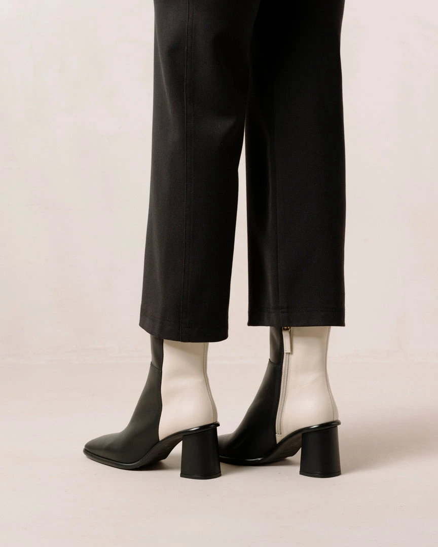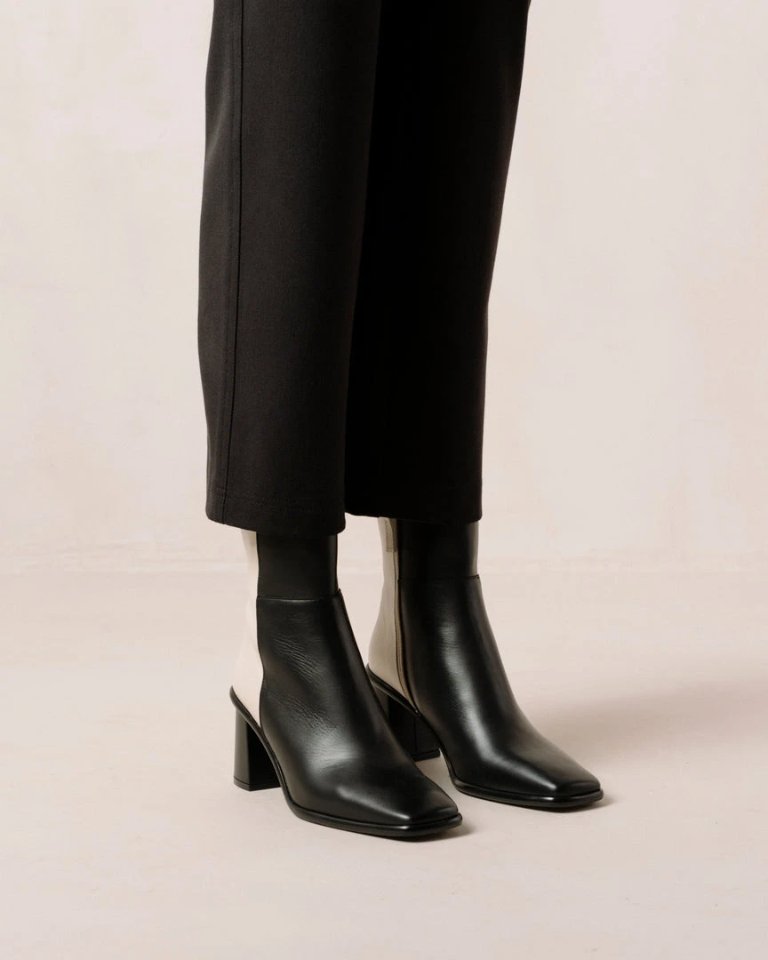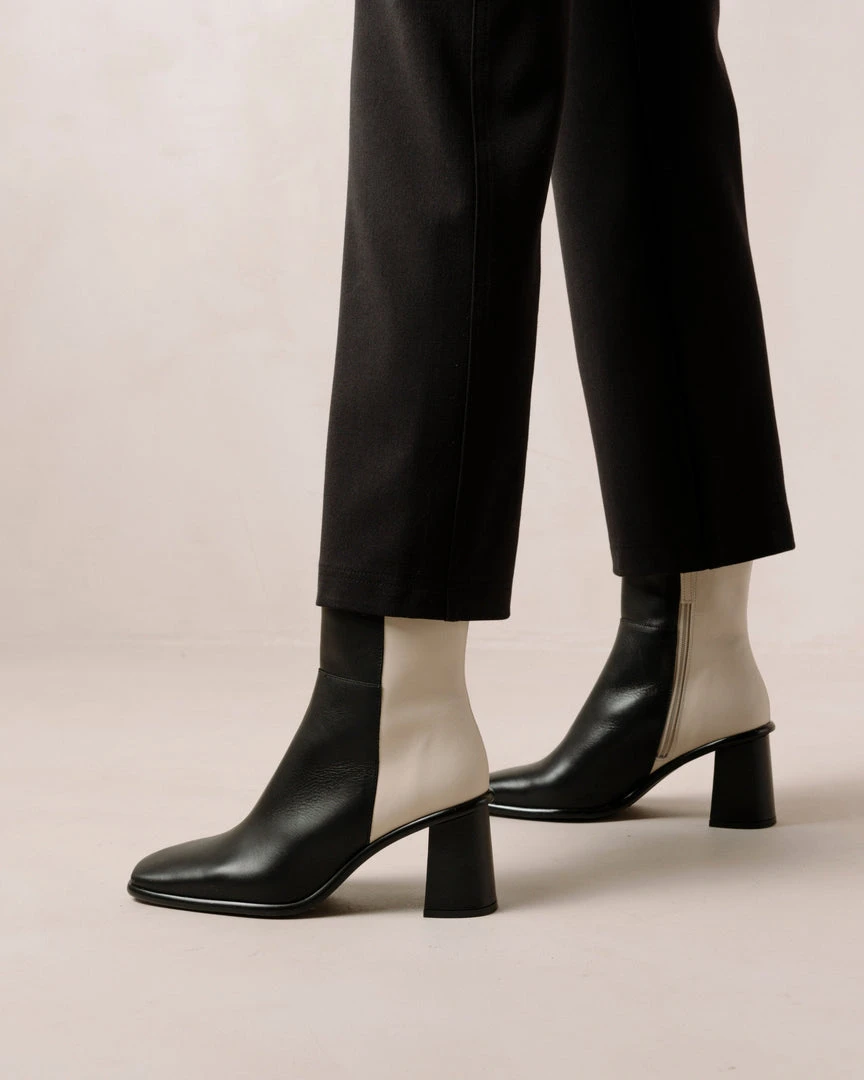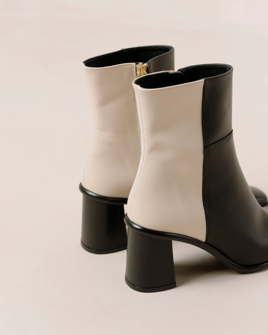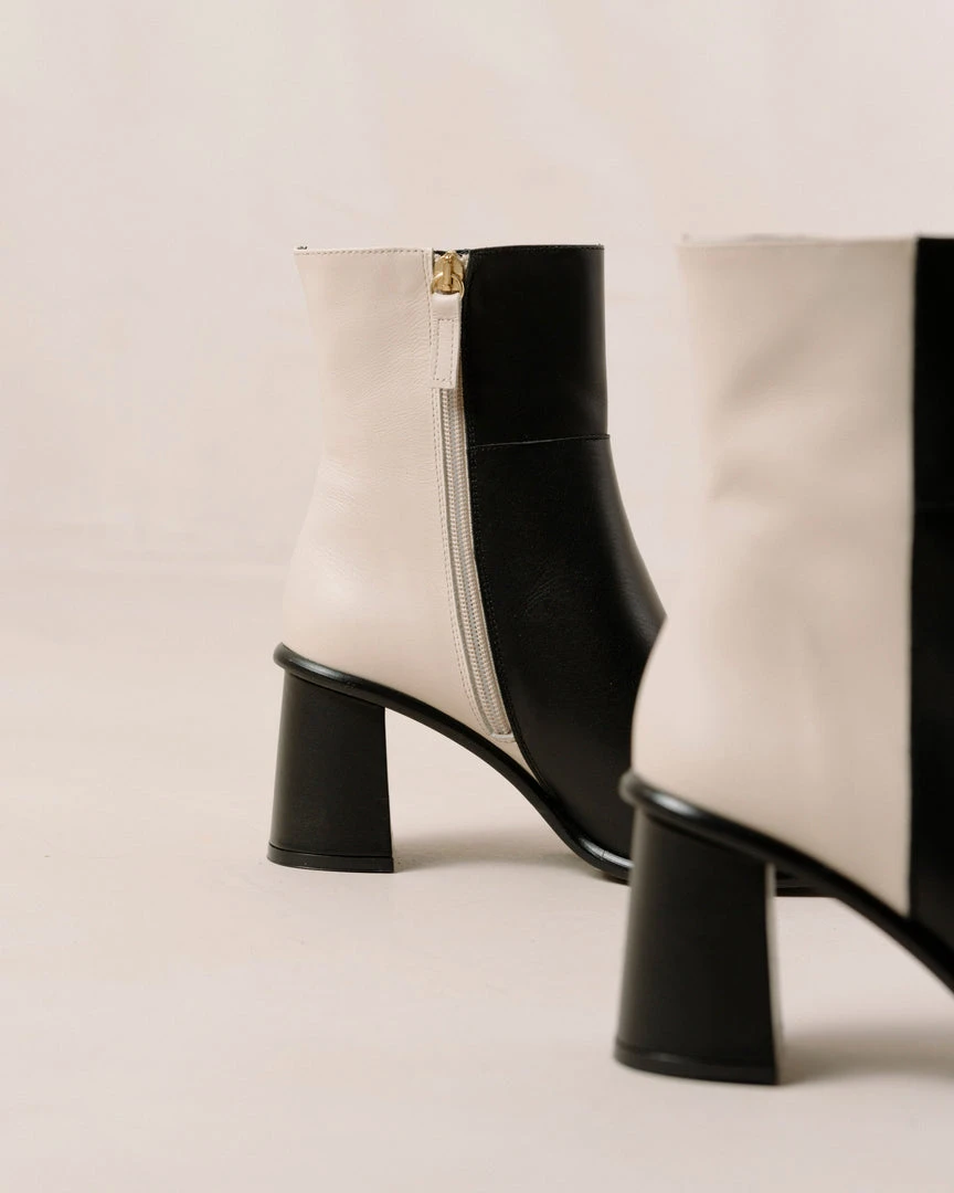 Black and white block heel ankle boots