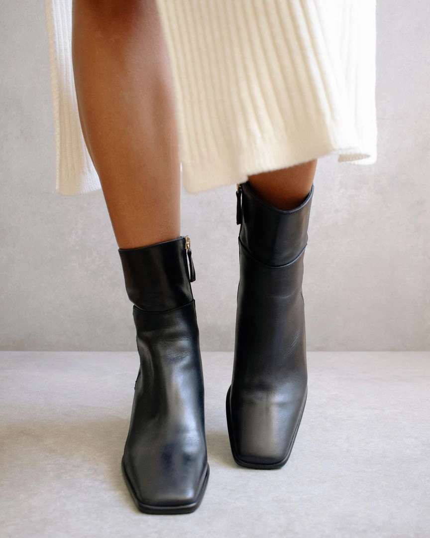 A total black look to get you on the hook. These ethical leather boots boast a jet black outer sole and a scintillating golden zipper detail. With their flattering square toe, the West Total Black will always have your back.