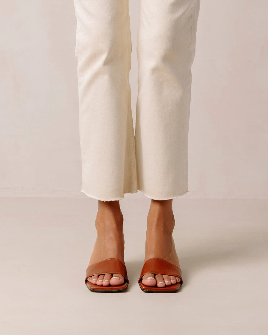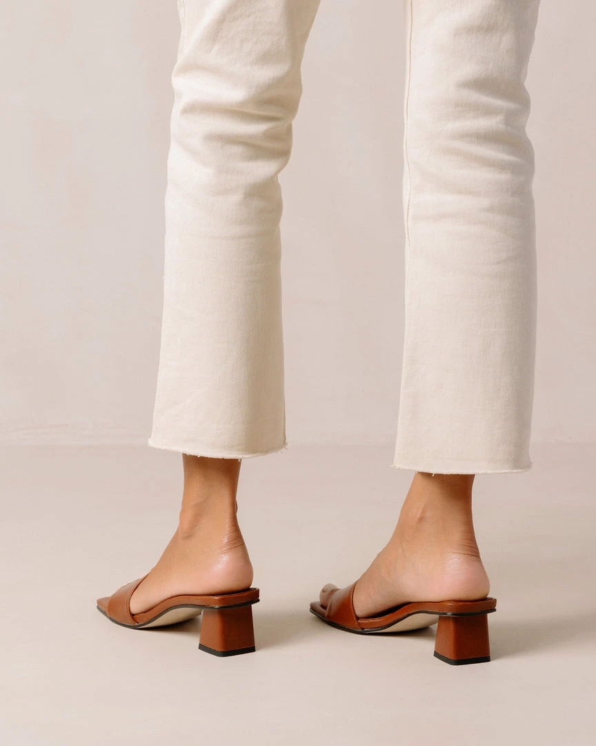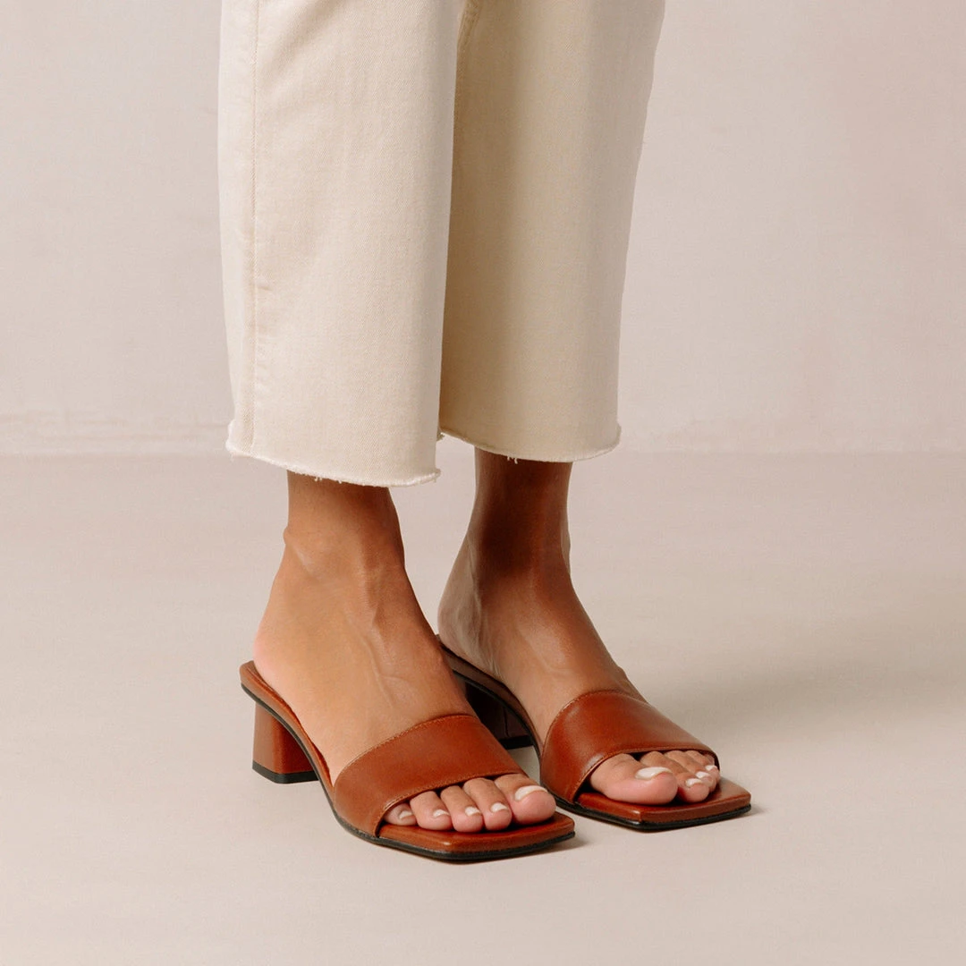 Cute low-key vegan sandals with an open toe, front strap and short block heel. Perfect to comfortably slip on and elevate any outfit.