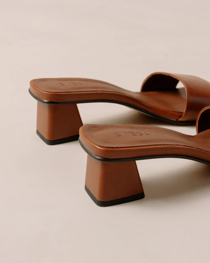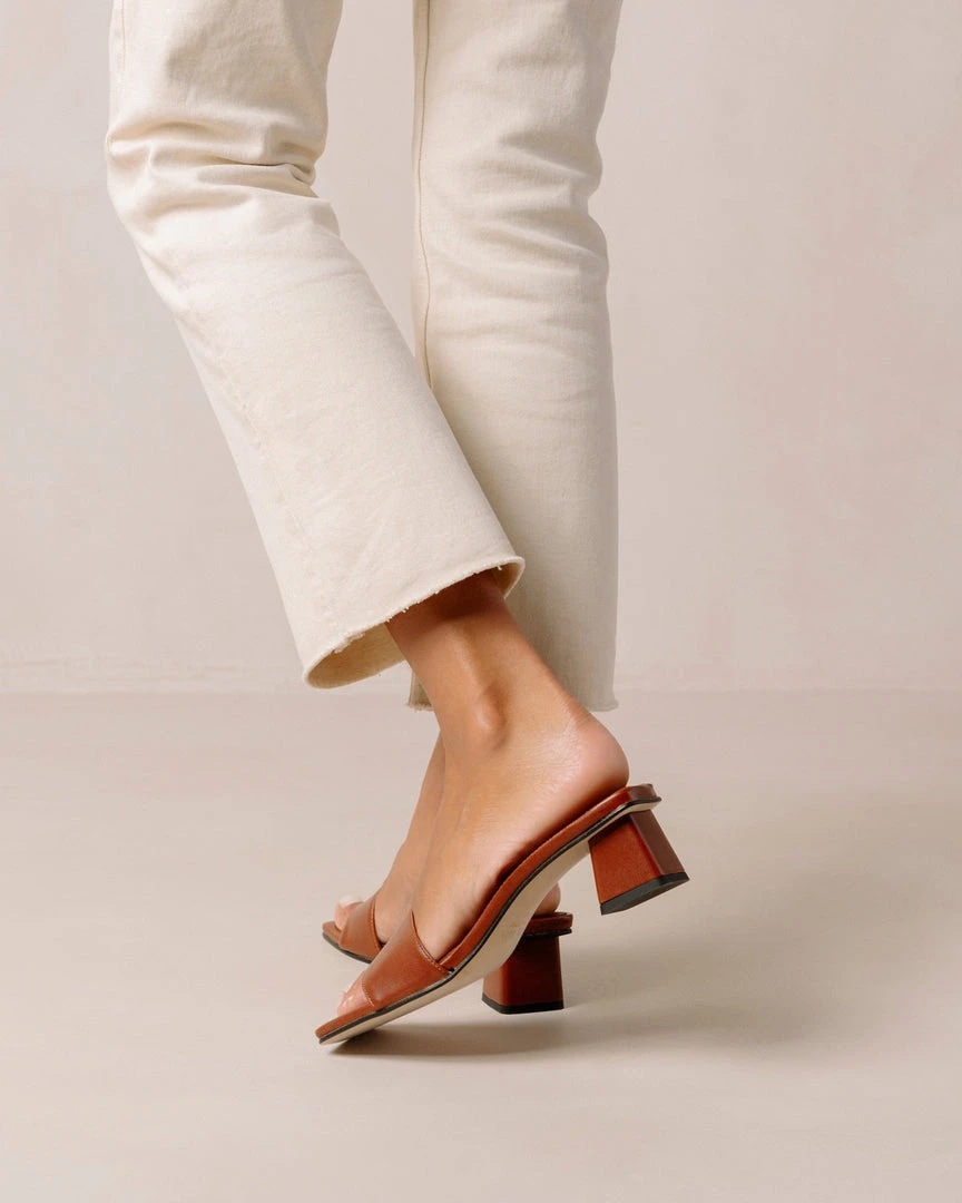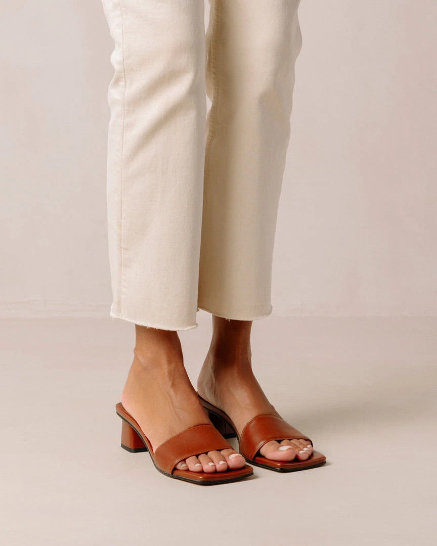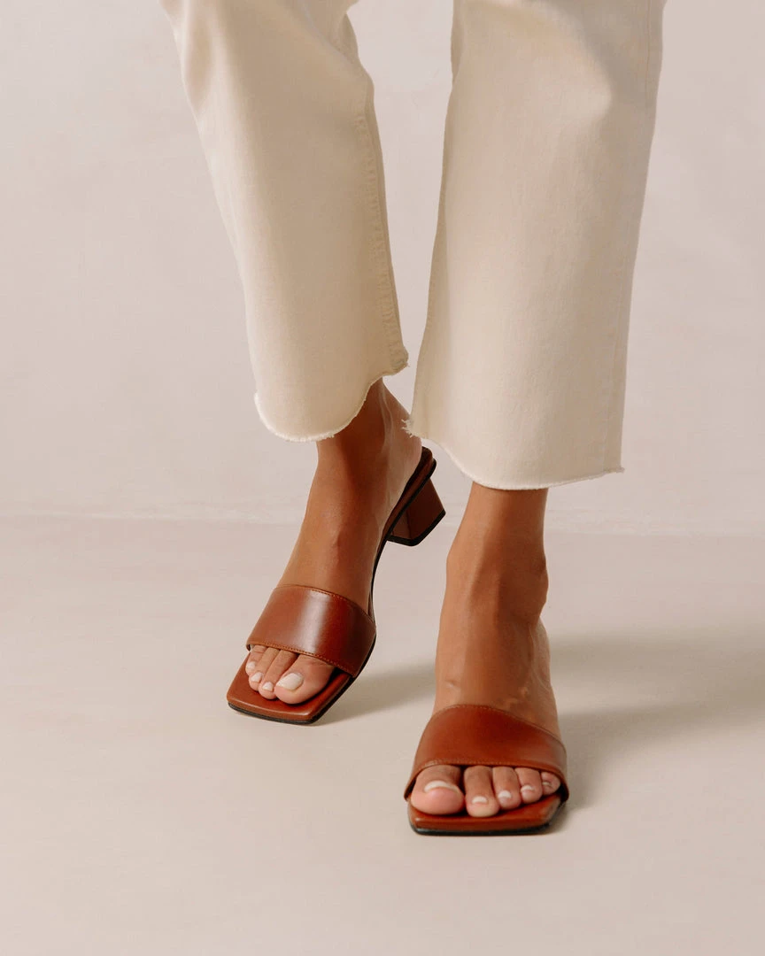 Cute low-key vegan sandals with an open toe, front strap and short block heel. Perfect to comfortably slip on and elevate any outfit.