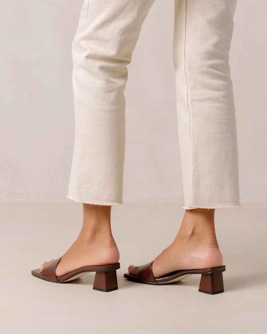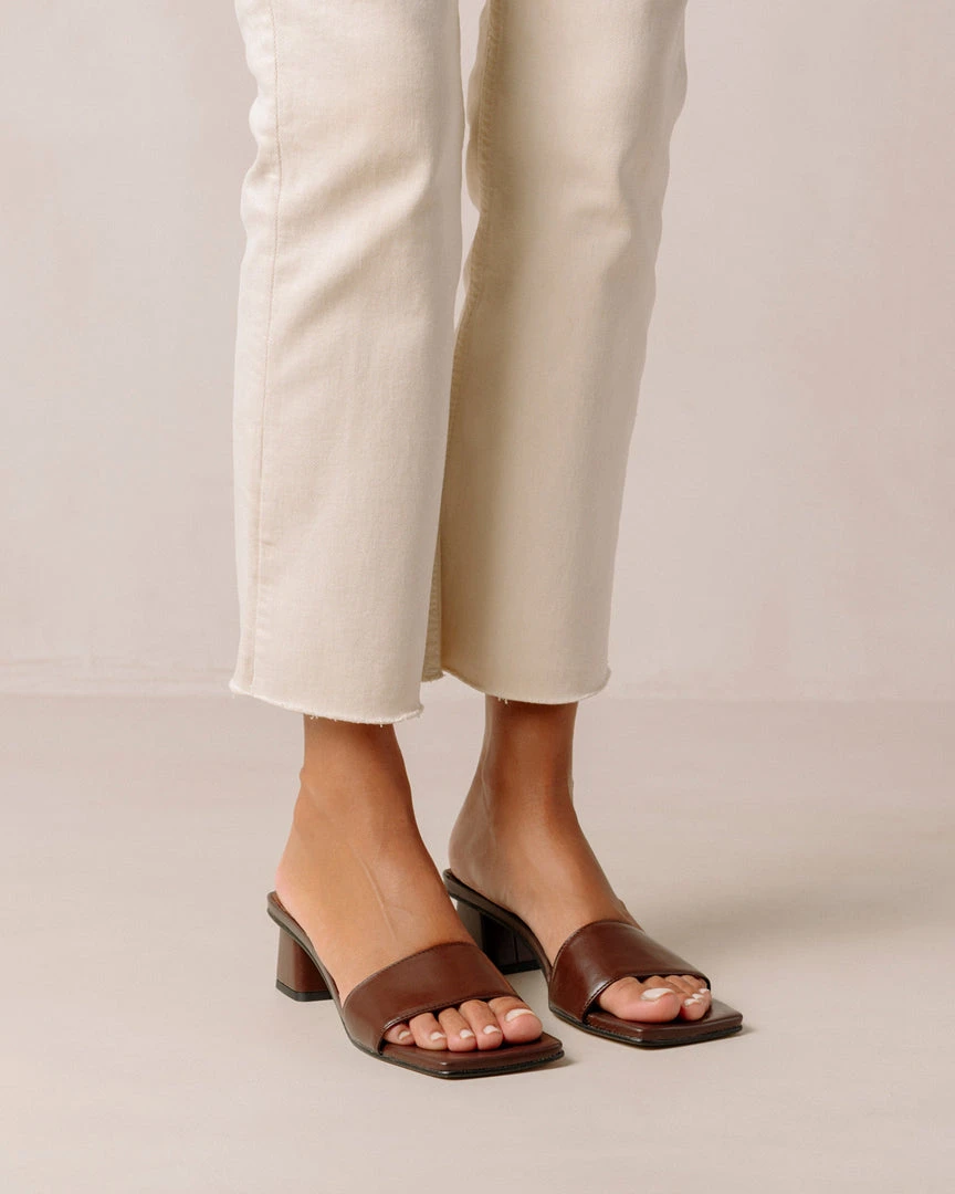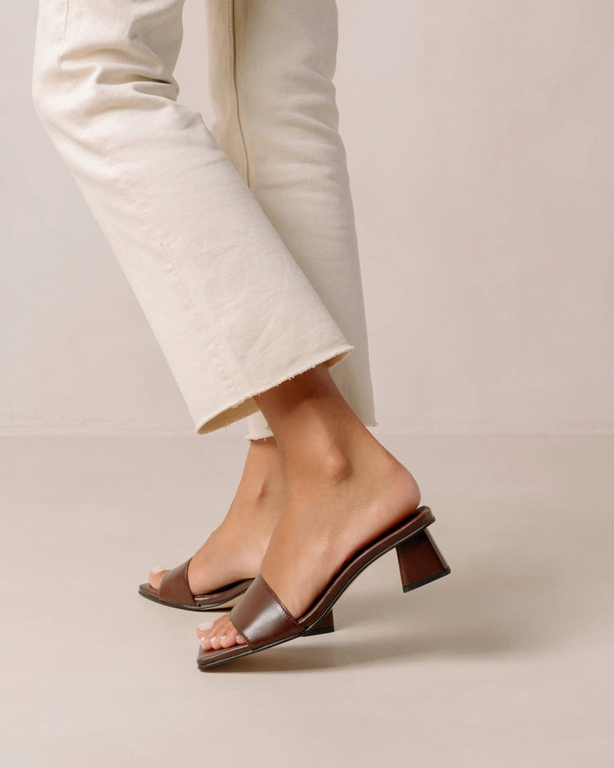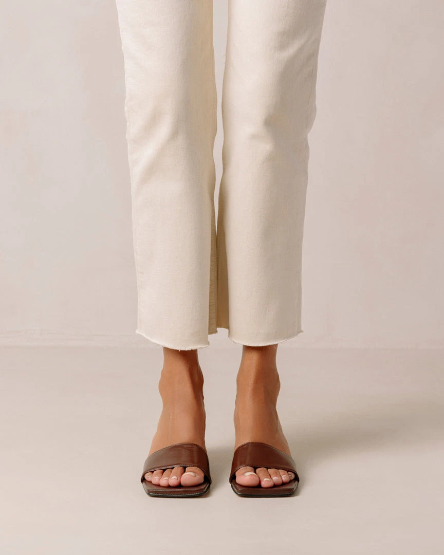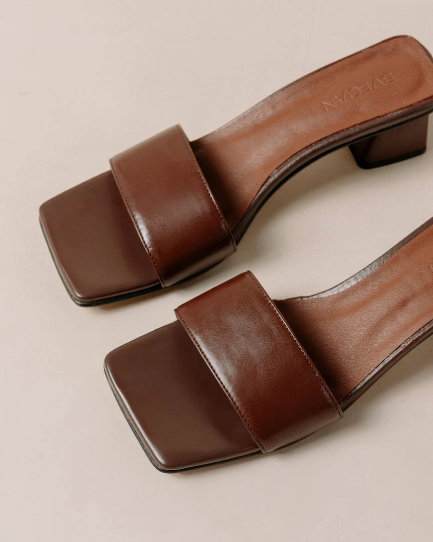 Cute low-key vegan sandals with an open toe, front strap and short block heel. Perfect to comfortably slip on and elevate any outfit.