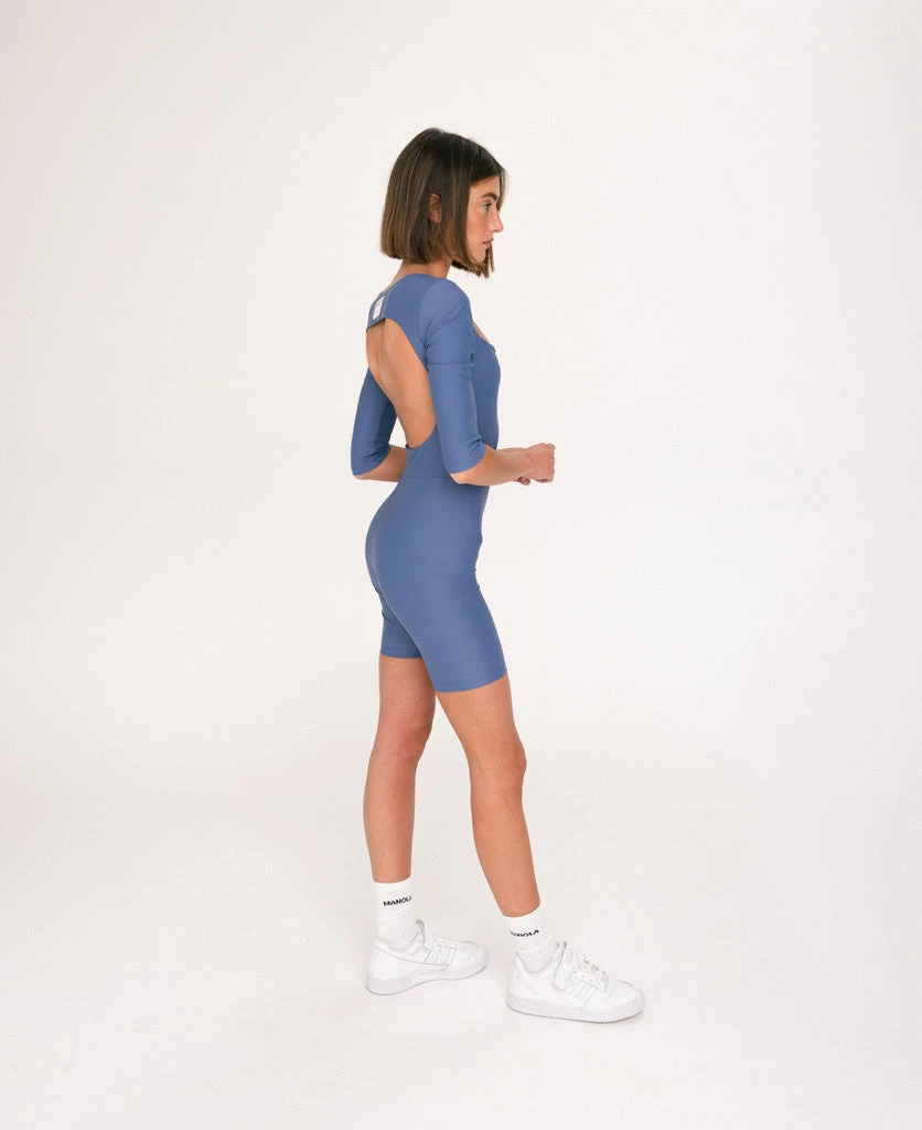 Three-quarter sleeve bodysuit with biker leggings. Its wide neckline and open back makes it a fresh and very feminine jumpsuit but still sporty, either for your favorite workout or leisure time. Built-in sport bra for added support and security. High waist that enhances your silhouette. Lightweight and stretchy fabric that feels like a second skin for comfort and softness. Choose between Black or Riad, our core MANOLA colors or the Niagara, one of our GYM SS22 collection favorites.