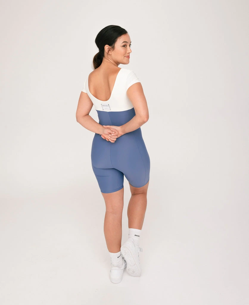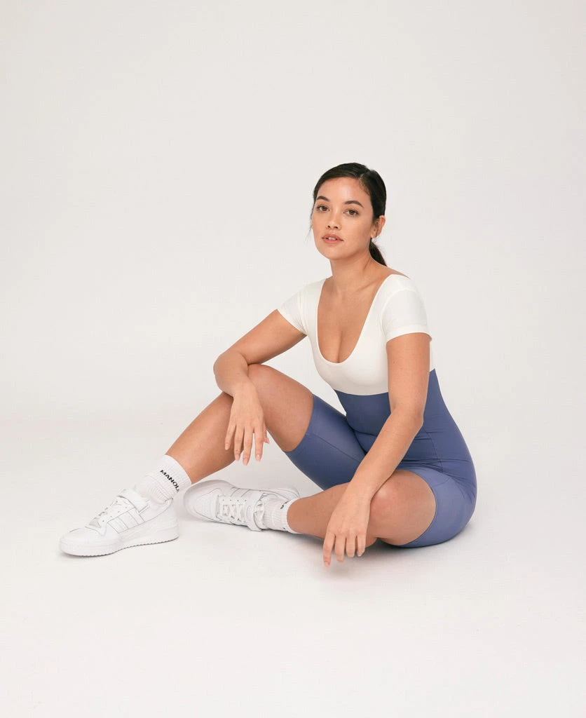 Two-tone contrast bodysuit with short sleeves and biker leggings. Neckline and low back to stylize your silhouette and give a feeling of freedom and freshness. Built-in sports bra for more support and safety in your exercise routines of any intensity. Shaping waistbands to stylize and enhance your figure. Lightweight and stretchy fabric that feels like a second skin for comfort and softness. Choose from the combination black/avorio, riad/avorio, our Core MANOLA colors; or the niagara/avorio combination, one of our GYM SS22 collection favorites.